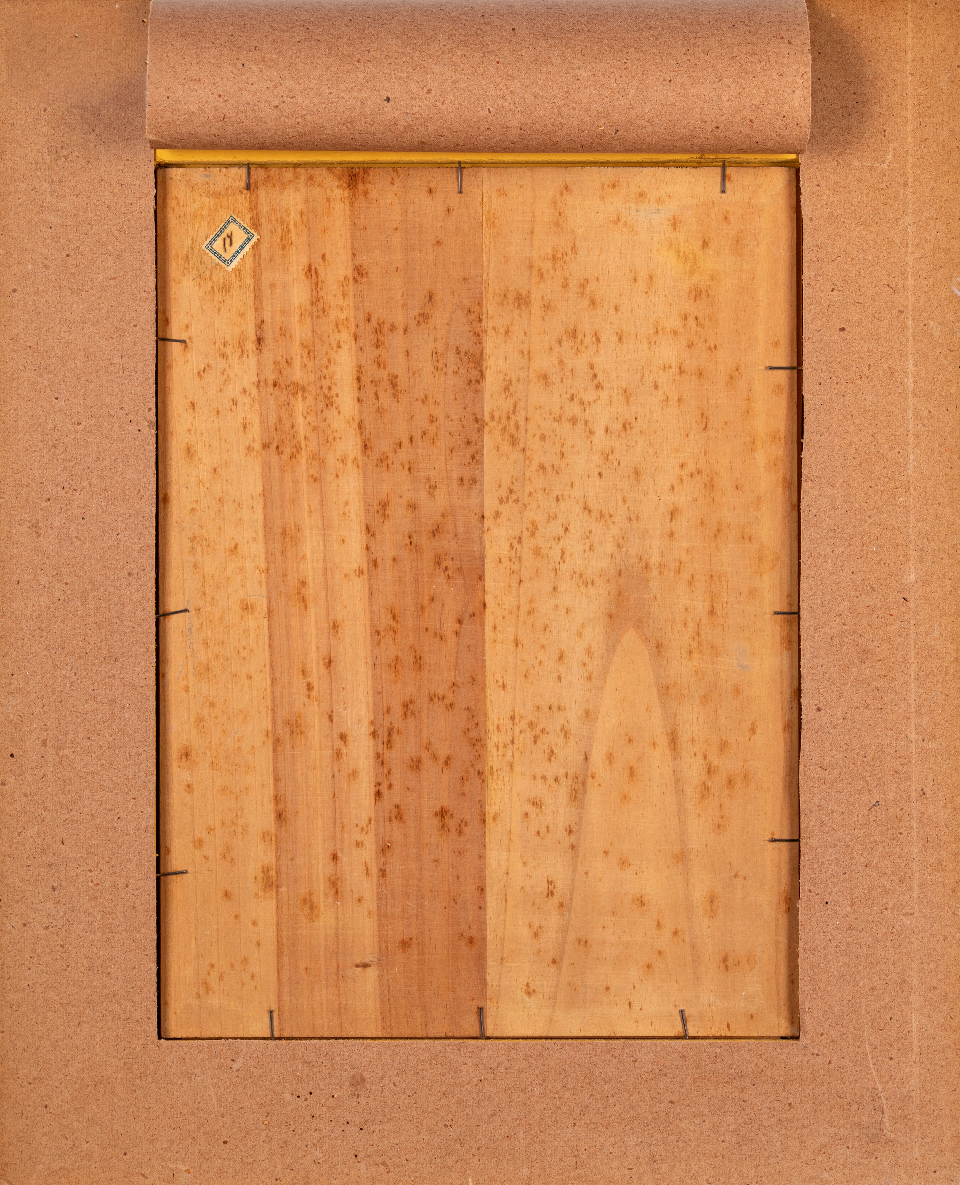 al retro, sulla tavola, vecchia etichetta con numero di inventario 18