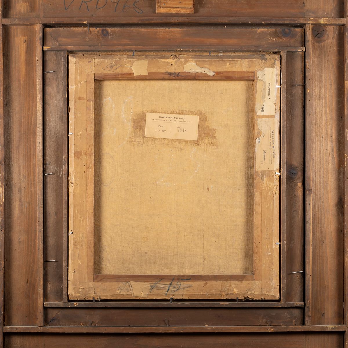 Sul retro: sulla tela, antico cartellino a stampa della Galleria Milano con data 1.7.931 e numero di riferimento (1048); sul telaio altro cartellino a stampa della Galleria Milano e cartellino a stampa strappato Proprietà...ini.