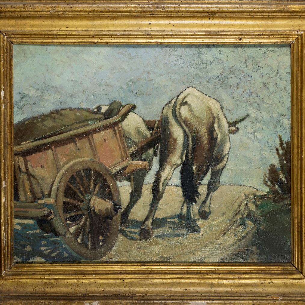 Sul retro, intitolato e firmato a matita dall'artista: Caretto con Mucche / S. Bicchi / Livorno.