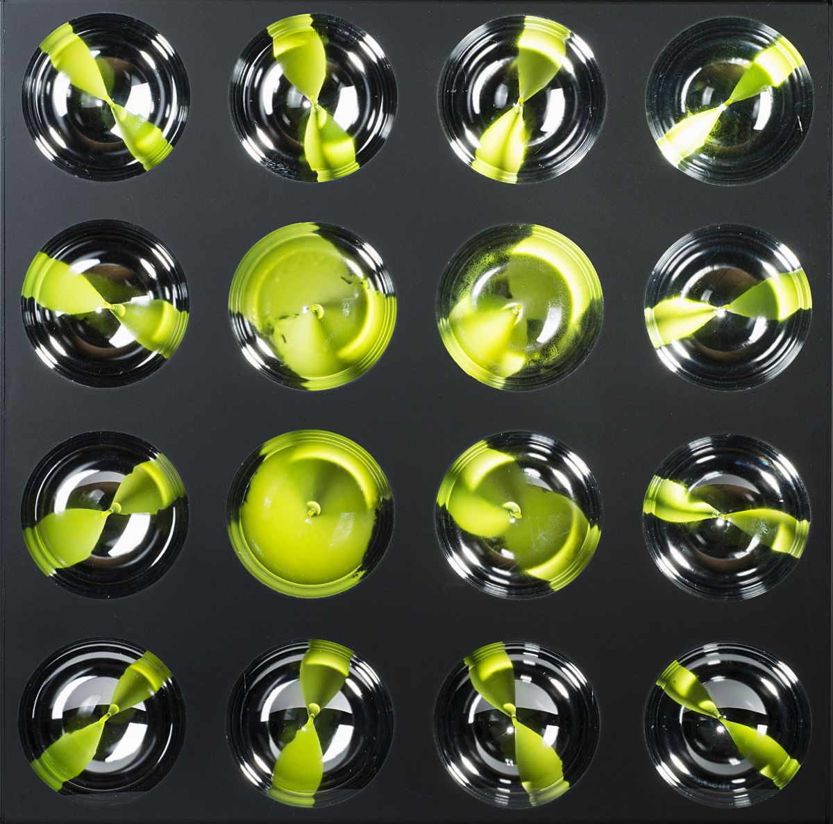 Oggetto cromocinetico 16 sfere, 1970-73 Sfere in metacrilato metalizzato e plexiglass 70 x 70 x 8,5