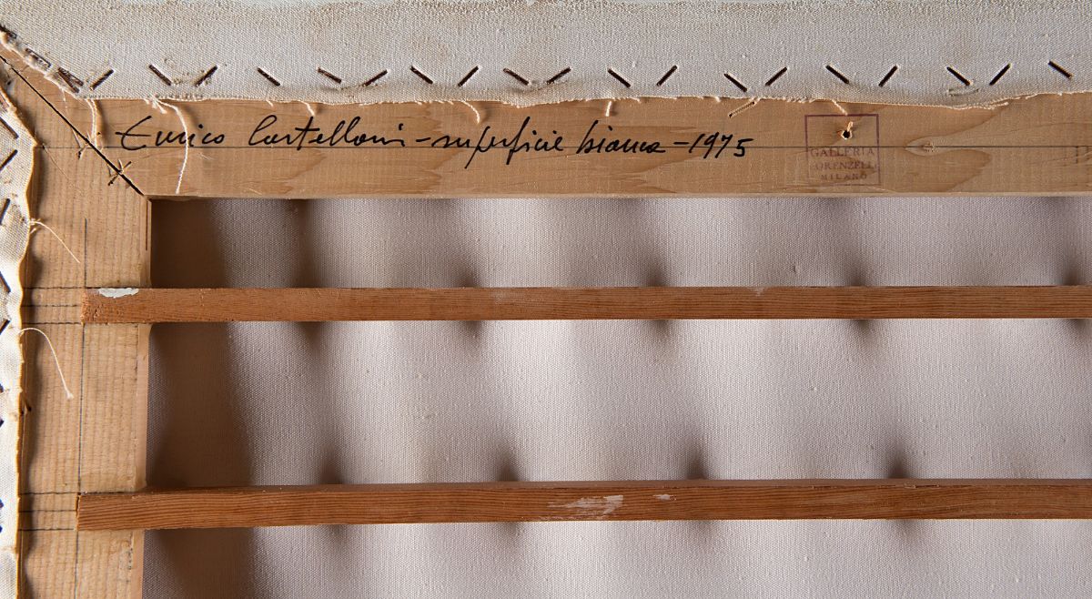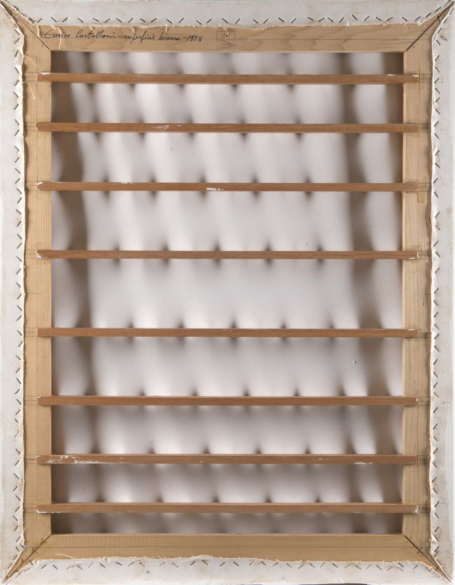 Firmato, titolato e datato al verso: Enrico Castellani - Superficie bianca - 1975