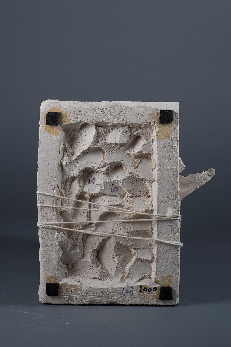 In terracotta refrattaria è rappresentato un libro con tre omini stilizzati legati ad uno spago.