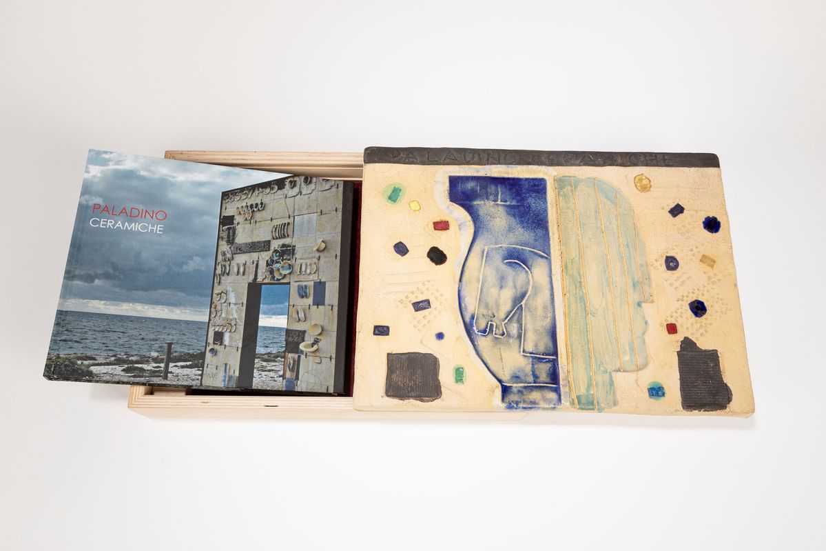 multiplo in ceramica smaltata policroma applicata su custodia in legno contenente un catalogo della