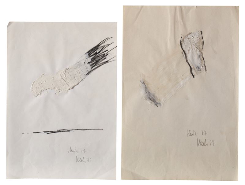 lotto di 02 tecniche miste e gesso su carta (a;b), 1977