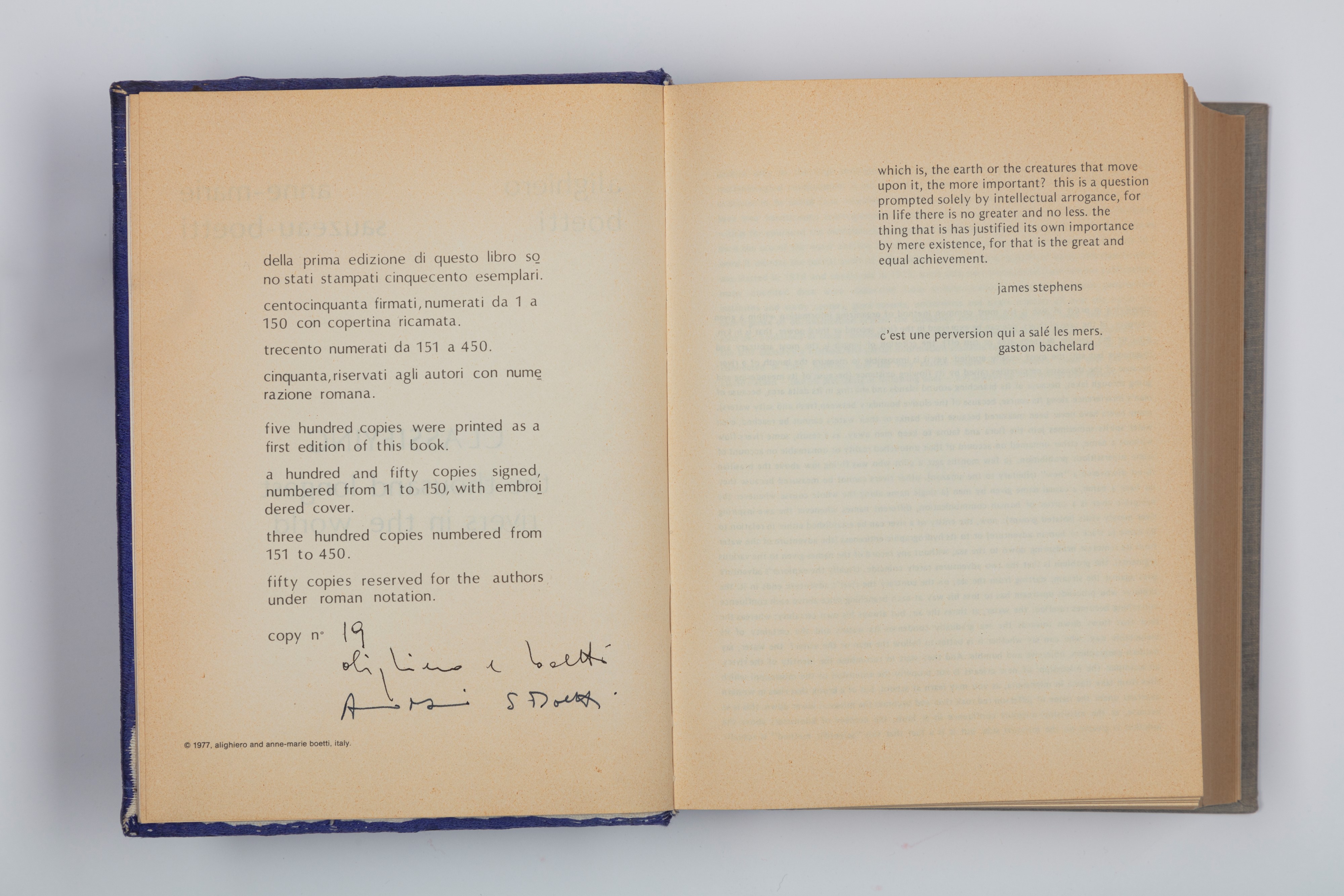 Firmato nel colophon: Alighiero e Boetti e Anne Marie S. Boetti