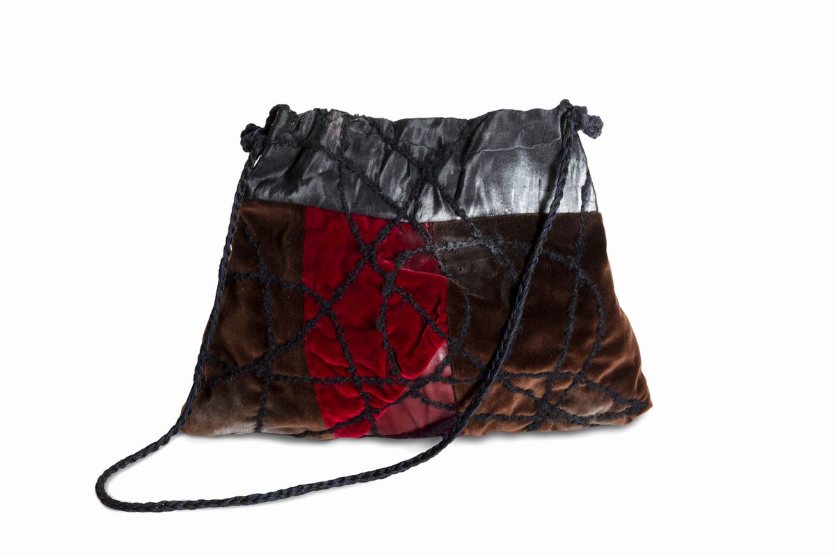 velluto, pelle, filo nero e cordoncino