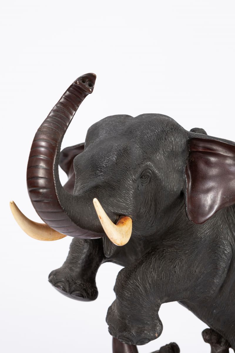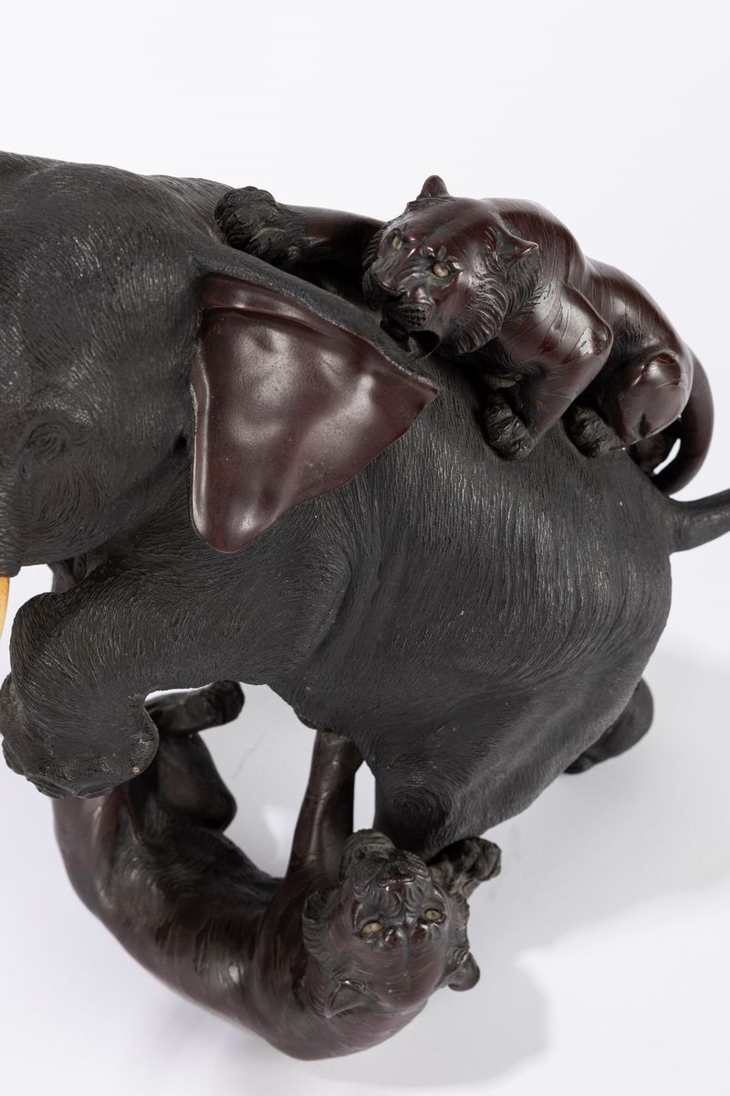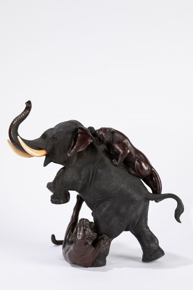 一组双虎袭大象青铜座。 日本,明治时期(1868-1912),(象牙部分是象牙製,署名 Mitsumoto-Saku)