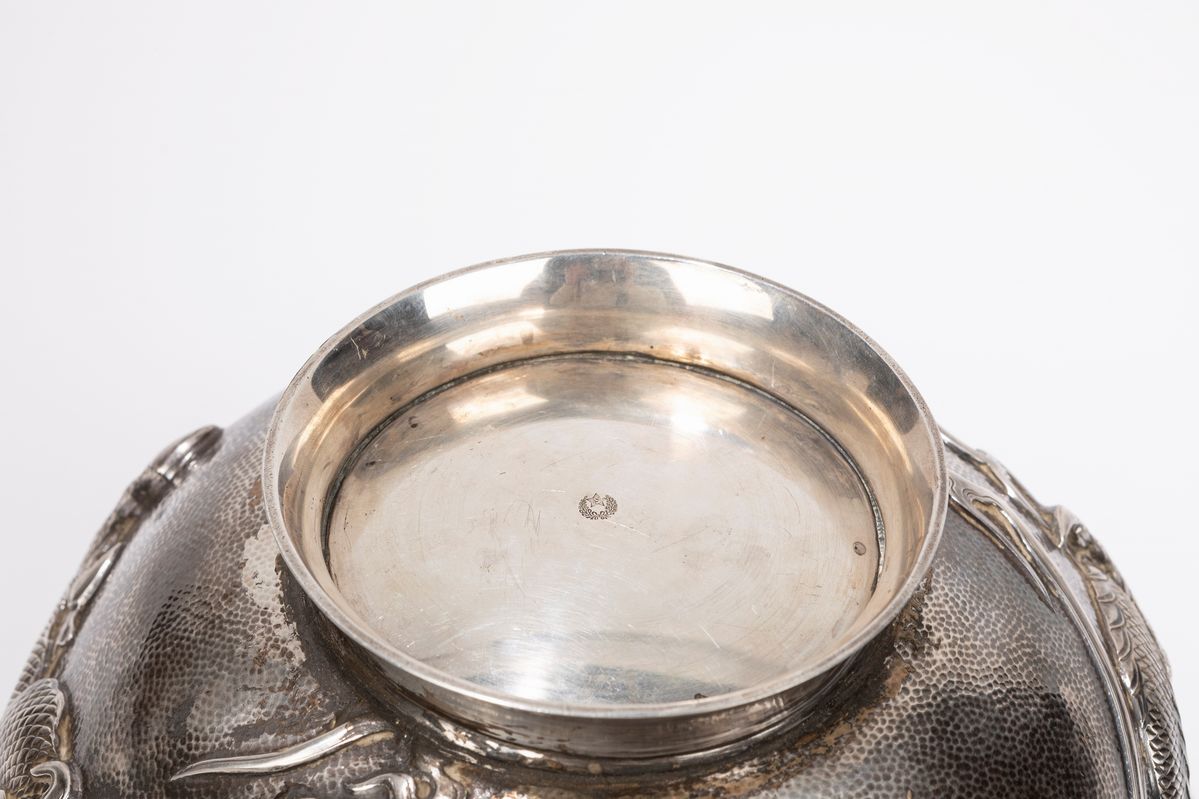 Di forma globulare è finemente sbalzato con un dragone a tre artigli; sulla base reca un punzone. Peso tot. g 825.