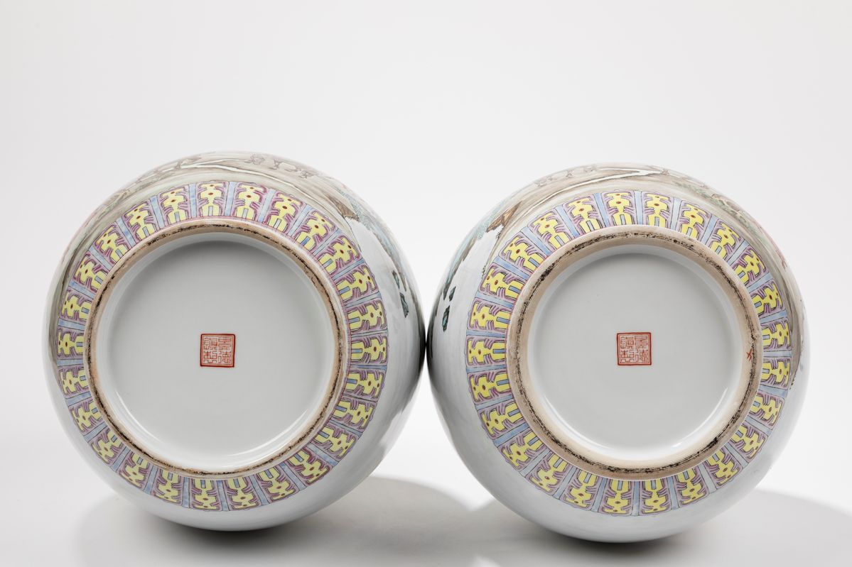 Di forma a bottiglia, sono decorati sulla pancia con gli otto cavalli di Wang Mu; sulla base recano il marchio impresso di Jingdezheng.