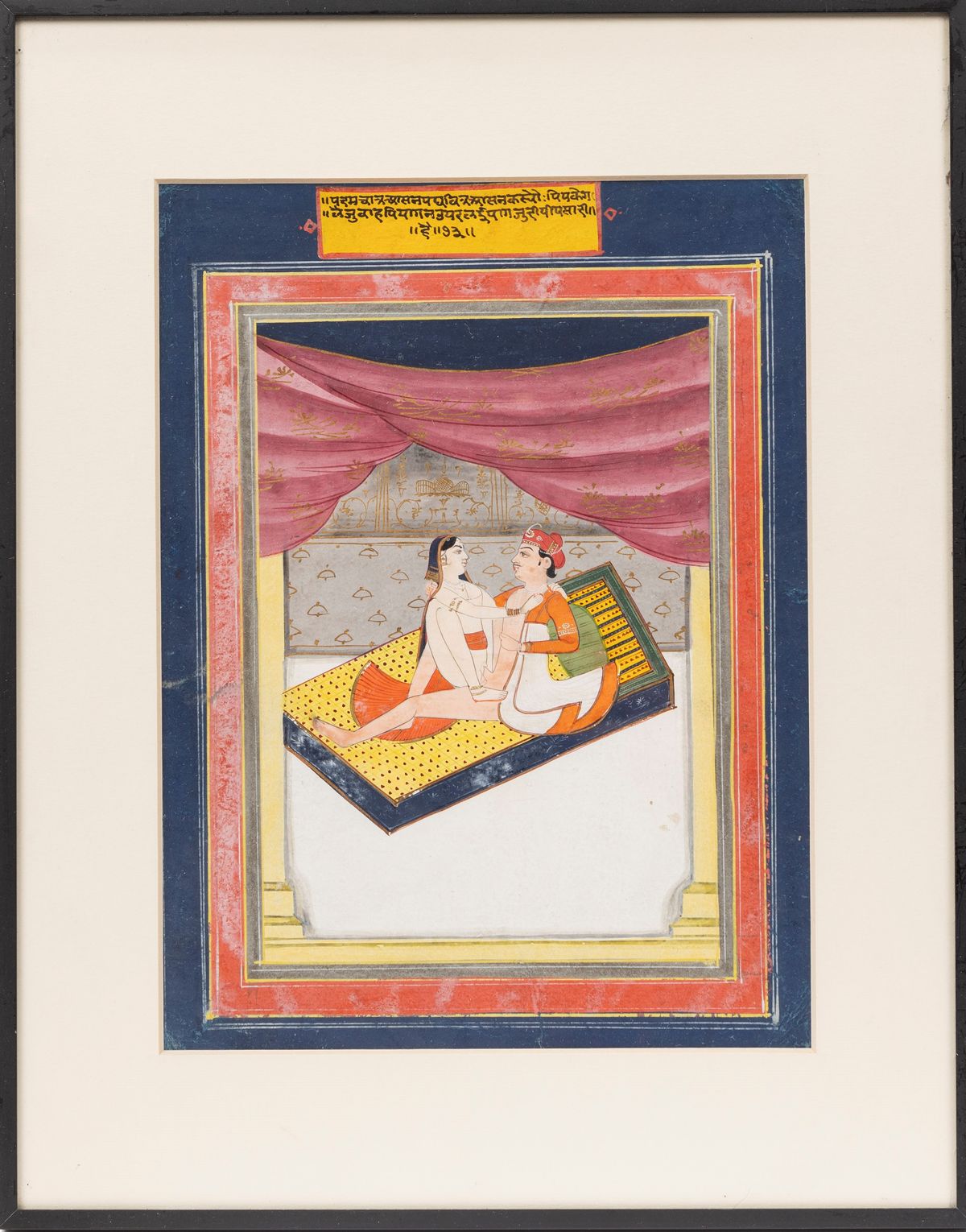 Sotto un baldacchino con una grande tenda, pronta ad essere calata a difesa dell’intimità, sdraiata su un sontuoso giaciglio e grandi cuscini, la coppia di amanti si destreggia alla ricerca del piacere in una posizione acrobatica.Note di catalogo:Nella tradizione dell’arte erotica indiana furono prodotti nel XIX secolo album che contenevano le varie posizioni descritte dal Kamasutra. La scuola pittorica che più di altre si dedicò alla produzione di album erotici fu quella di Jaipur in Rajasthan, riconoscibile dall’uso di un blu intenso della cornice.