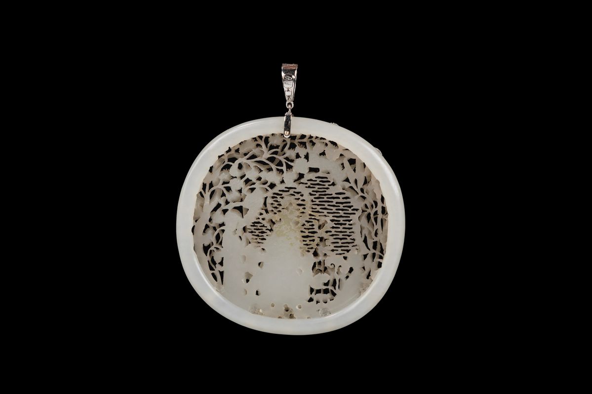 La placca ovale è scolpita con uno sfondo trafora che imitano una rete; al centro del pezzo, in basso rilievo, una figura impugna uno scettro ruyi, mentre un assistente è posizionato ai suoi lati; intorno ai soggetti si trovano bambù, pini, rocce traforate e una gru in volo. La pietra ha un tono bianco brillante e uniforme.