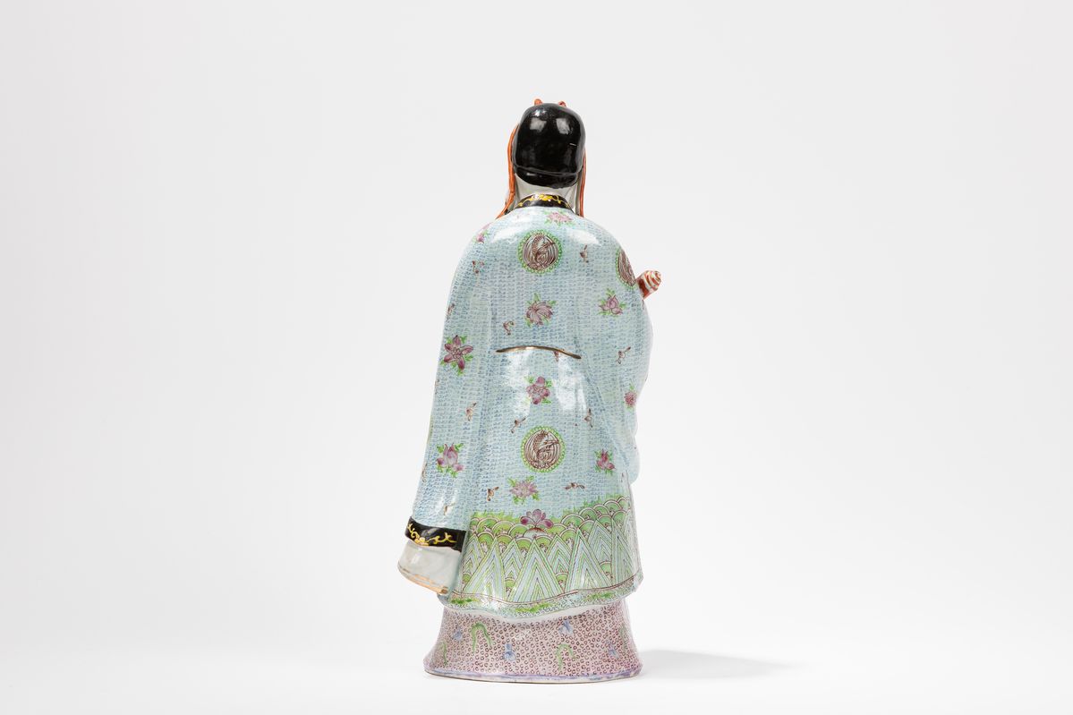 Vestito con un elegante abito a fondo turchese decorato con fiori di loto e medaglioni, tiene nella mano destra un rotolo rosso con laccio di chiusura verde.
