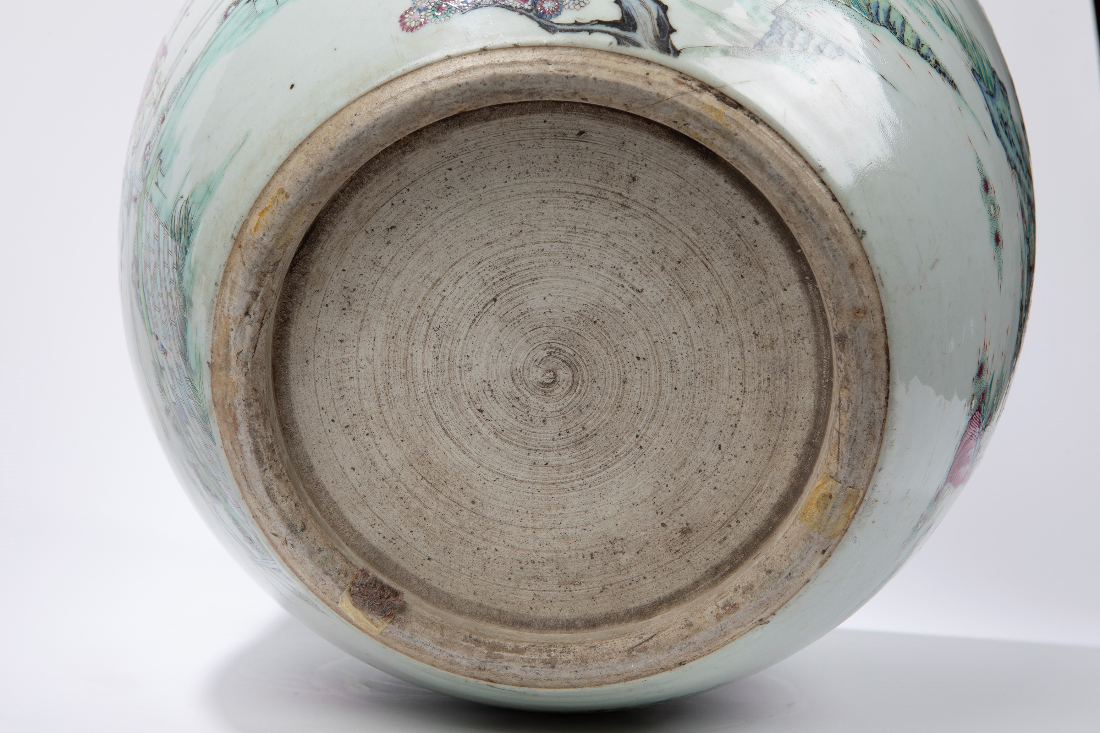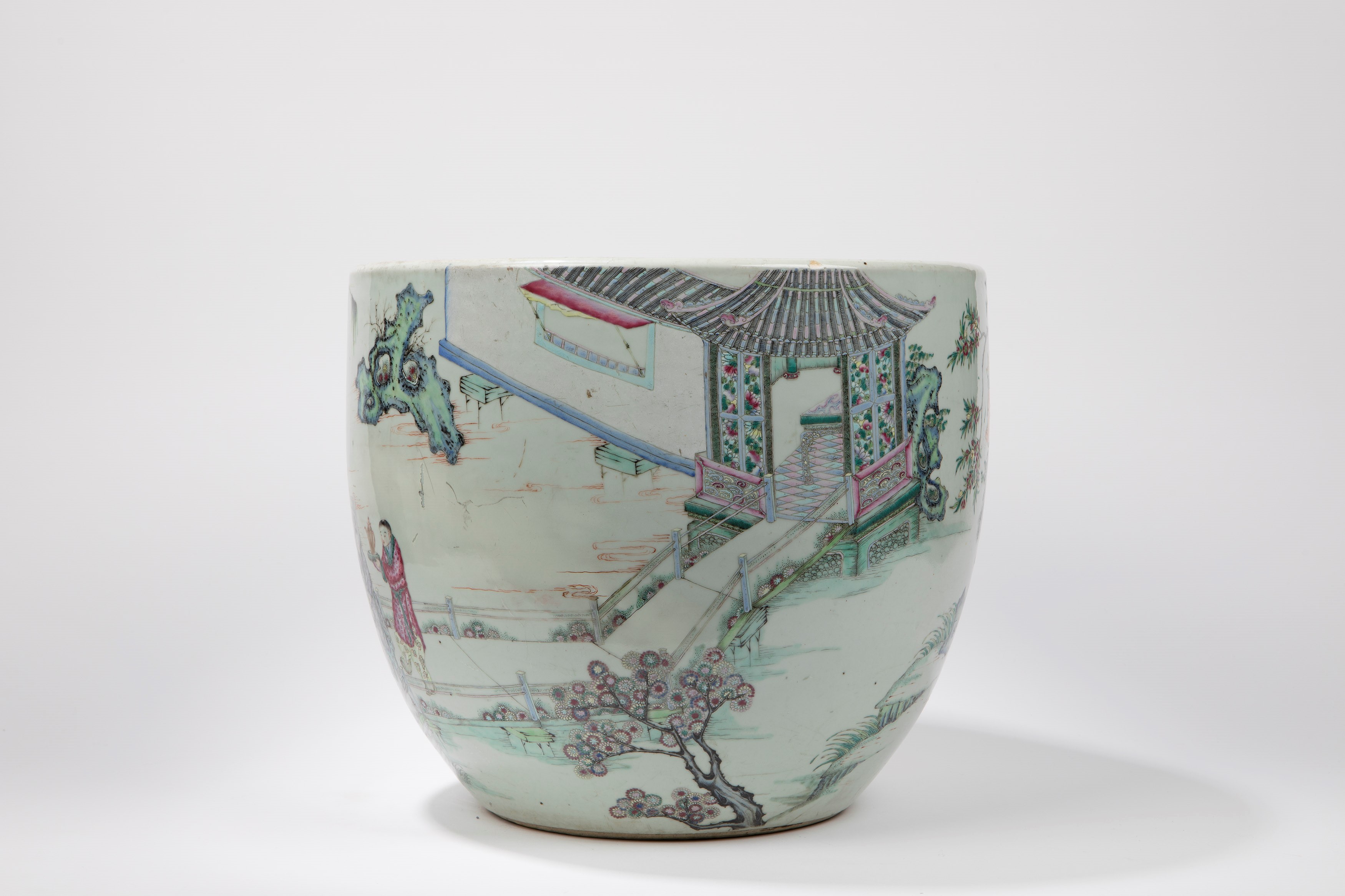 Ben dipinta sul corpo senza soluzione di continuità con una scena di corte con dame e letterati e bambini in un giardino tra alberi in fiore, rocce e palazzi.