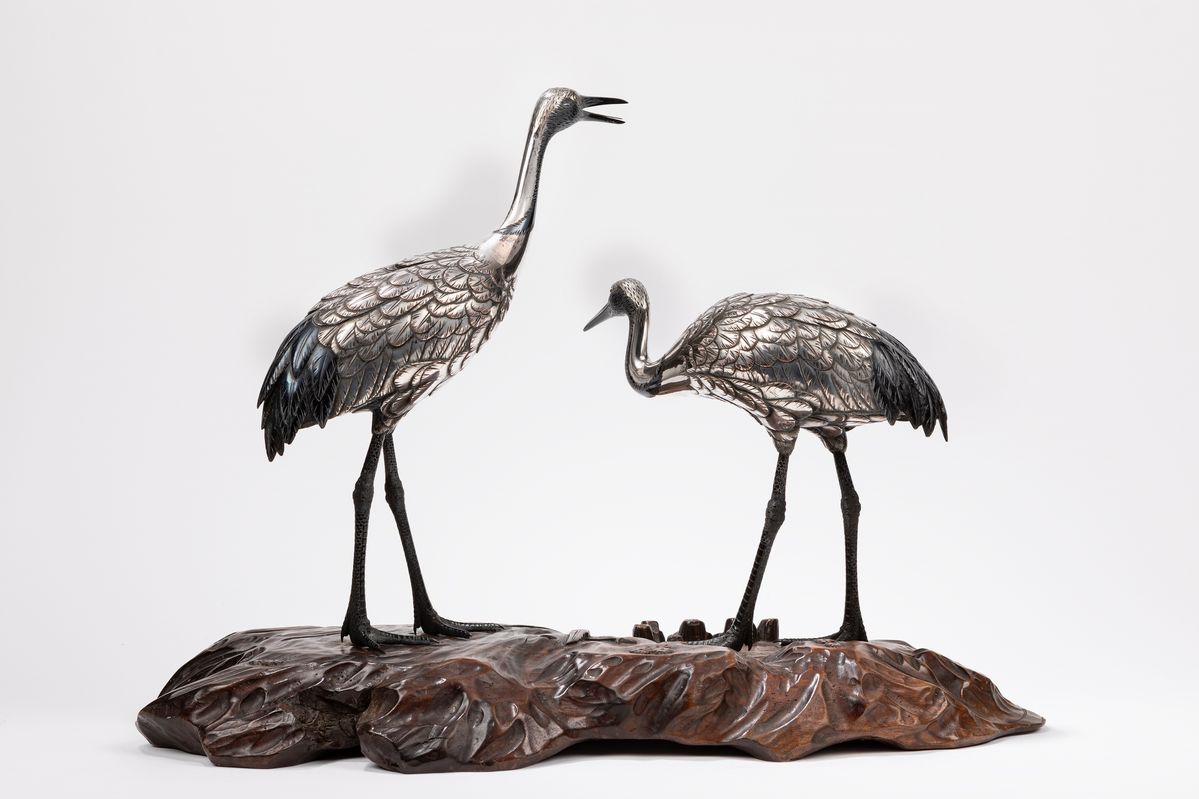 Raffigurante una coppia di Gru della Manciuria poggiante su una base in legno; firmato Hidenao entro riserva rettangolare dorata.