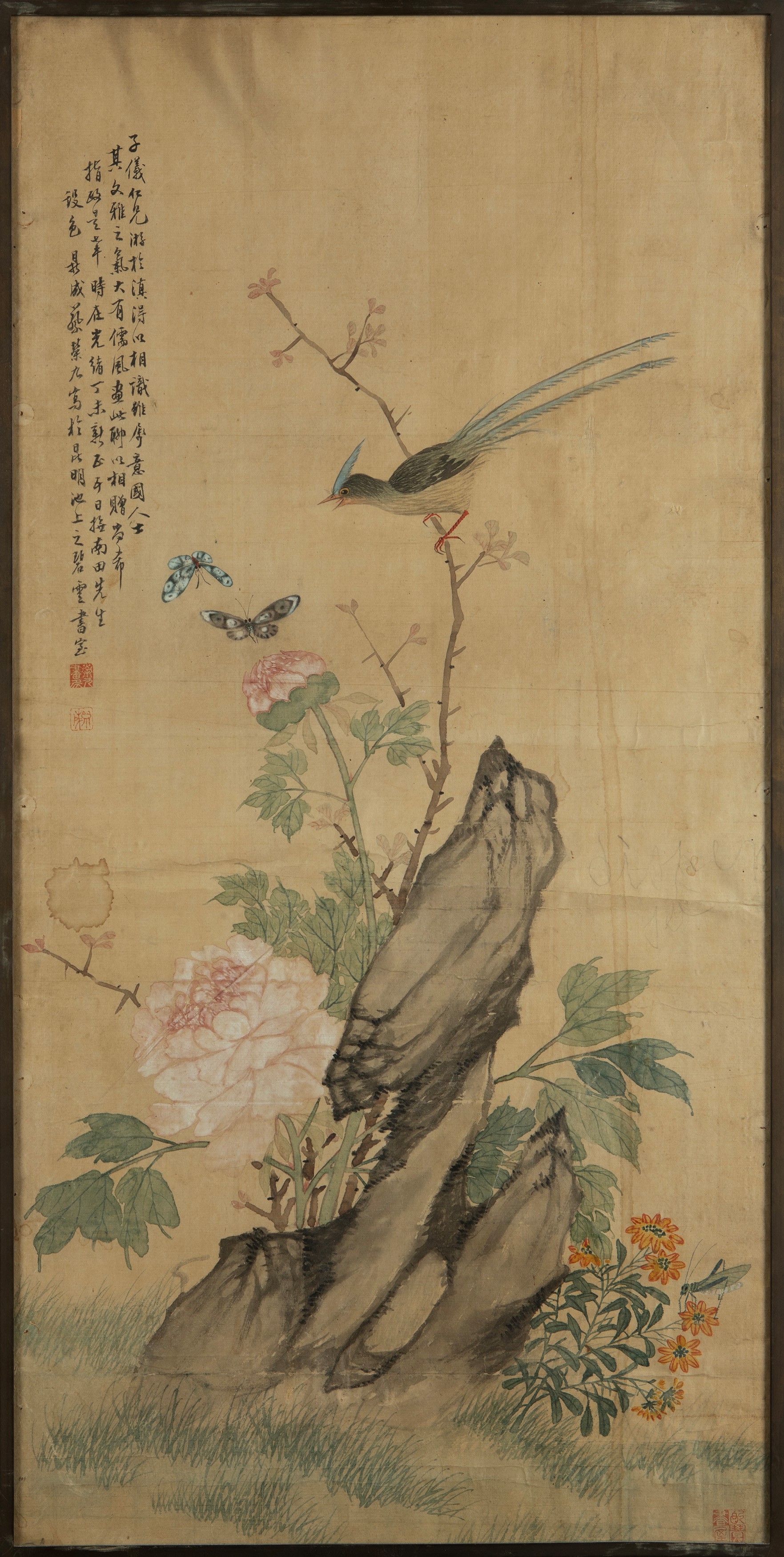 raffiguranti un paesaggio naturalistico con uccellino circondato da farfalle, che si posa su un ramo fiorito su una grande roccia dalla quale nascono peonie e fiori; l'altro con un vaso di fiori rigogliosi e una pianta, con iscrizioni (difetti)