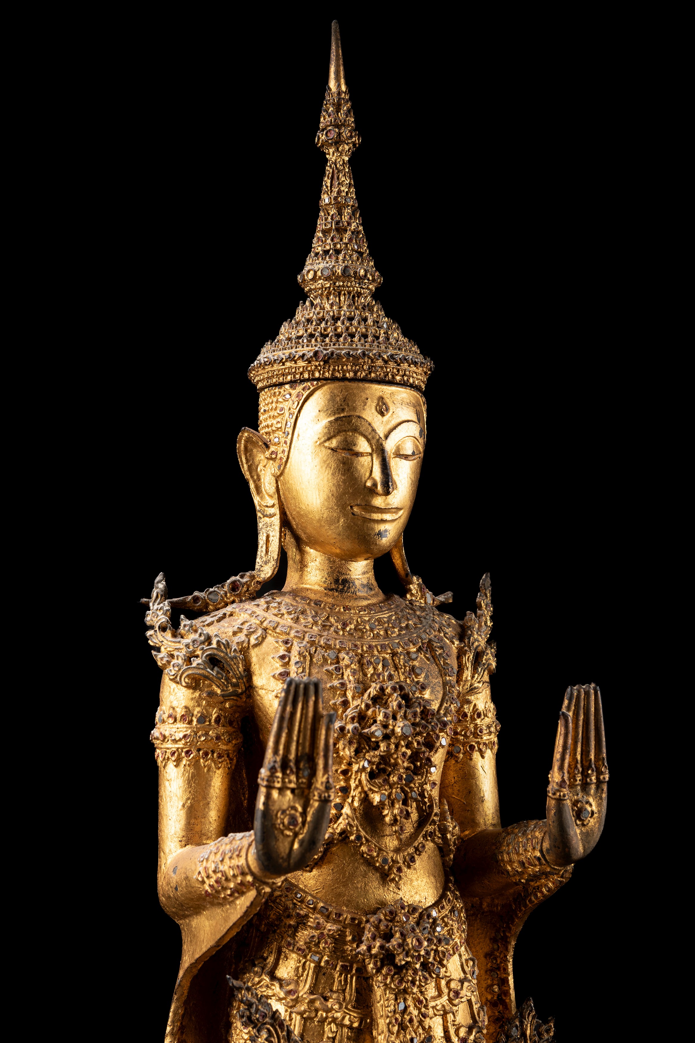 le mani sono sollevate in posizione verticale, con i palmi rivolti verso l'esterno, in Abhaya Mudra; Il Buddha è ornato da bracciali, braccialetti e cavigliere, ed è riccamente dorato con abiti da re; numerose piccole fiamme si innalzano dal piedistallo a quattro livelli, con piccoli specchi che evidenziano la sua energia ardente e la sua beatitudine al centro della veste e della corona