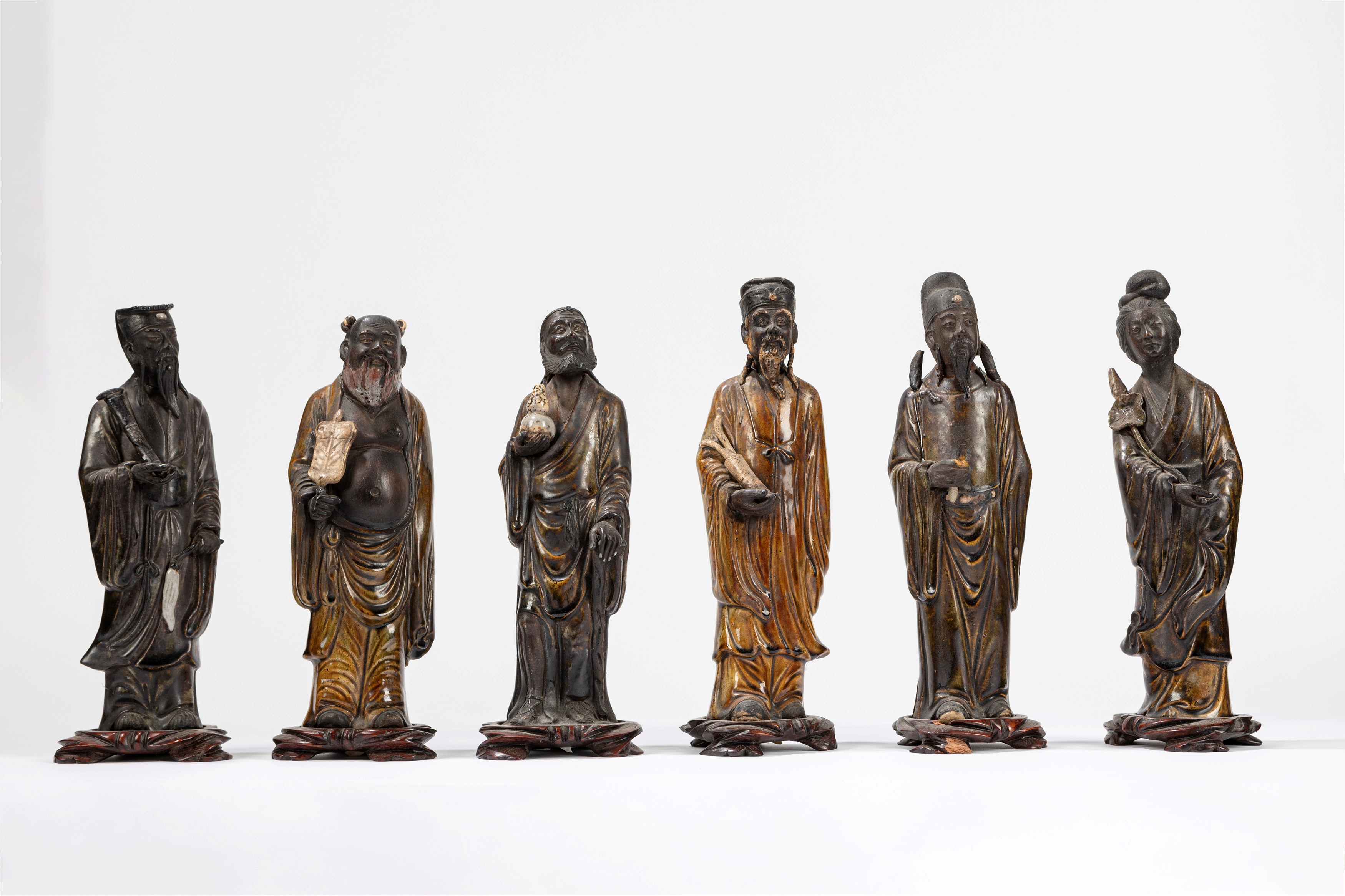 invetriati e smaltati, raffigurano sei degli Otto Immortali abbigliati nei costumi tradizionali, con basi in legno a finto terreno (difetti)