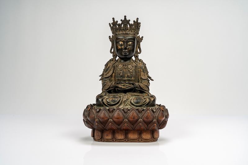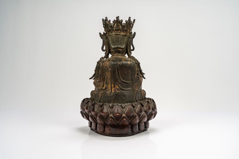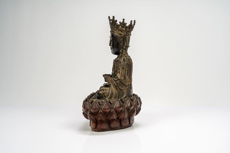 Guanyin in bronzo cesellato, con tracce di doratura, su base lignea a fiori di loto di epoca successiva. Cina, dinastia Ming, secolo XVII
