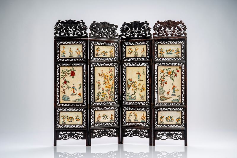 Paravento da tavolo a quattro ante in legno traforato, con pannelli in pietra dura decorati a rilievo con figure e motivi floreali policromi. Cina, inizi secolo XX
