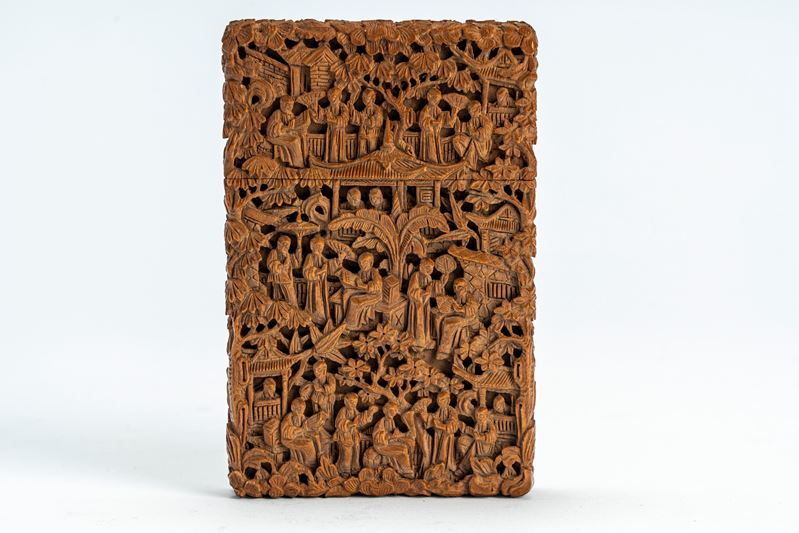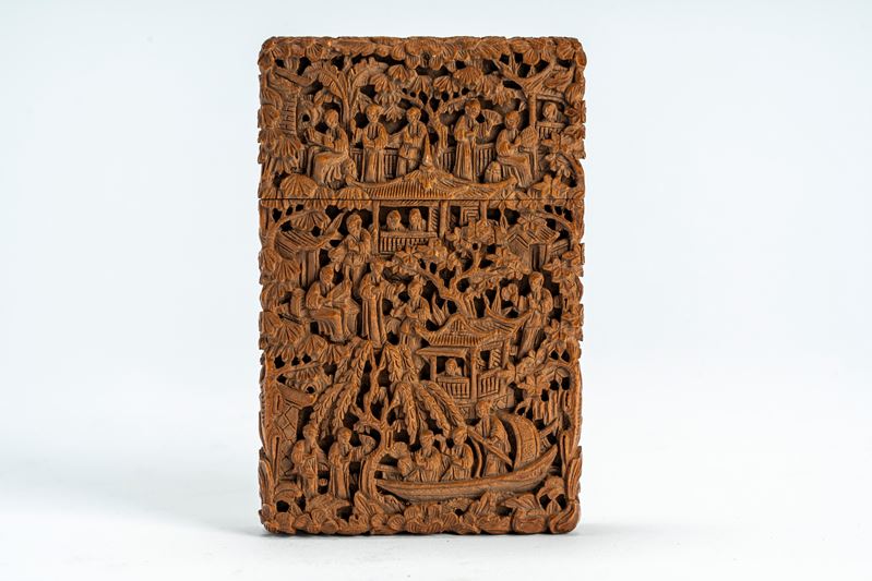 Porta biglietti in legno finemente intagliato con figure in un giardino di palazzo. Cina, Canton, secolo XIX
