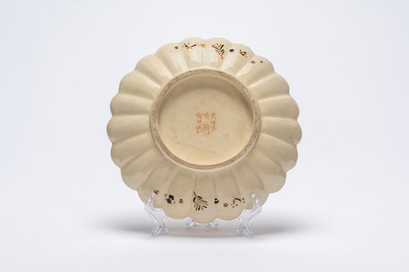 Bel piatto a crisantemo in ceramica Satsuma con bambini e farfalle, periodo Meiji, fine XIX secolo. Giappone, periodo Meiji