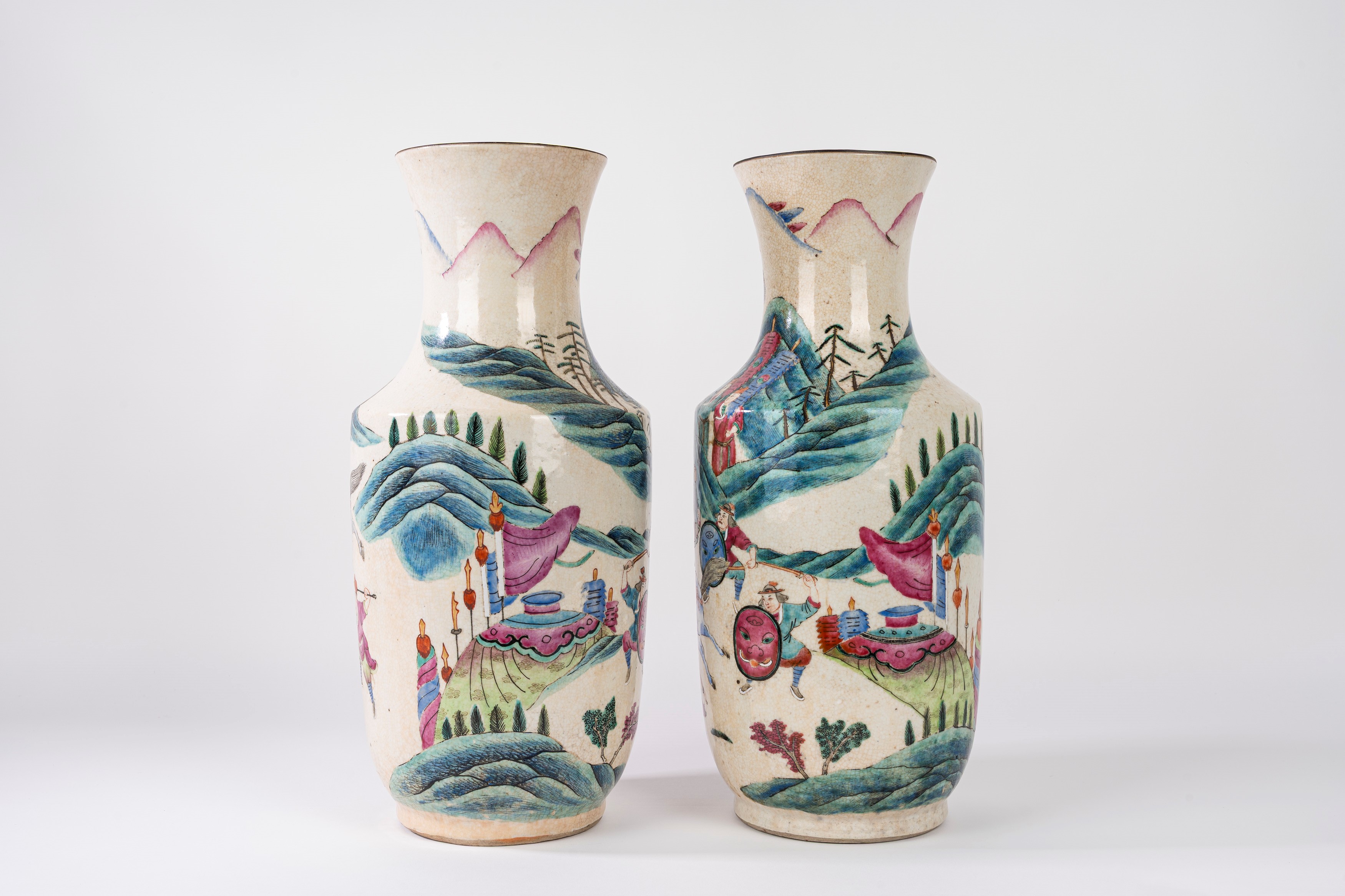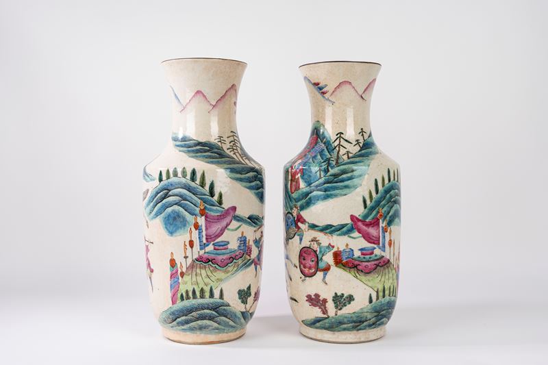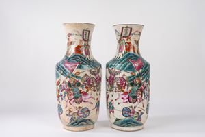 corpo a rullo con spalle sfaccettate, collo svasato e piede ad anello, in porcellana famille rose su caratteristico fondo craquelé, scena di battaglia tratta dal "Romanzo dei Tre Regni".