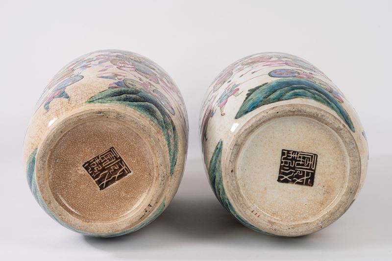 Bella coppia di vasi in porcellana policroma in stile Nanking, Cina, fine XIX secolo