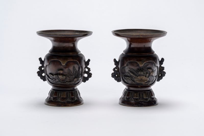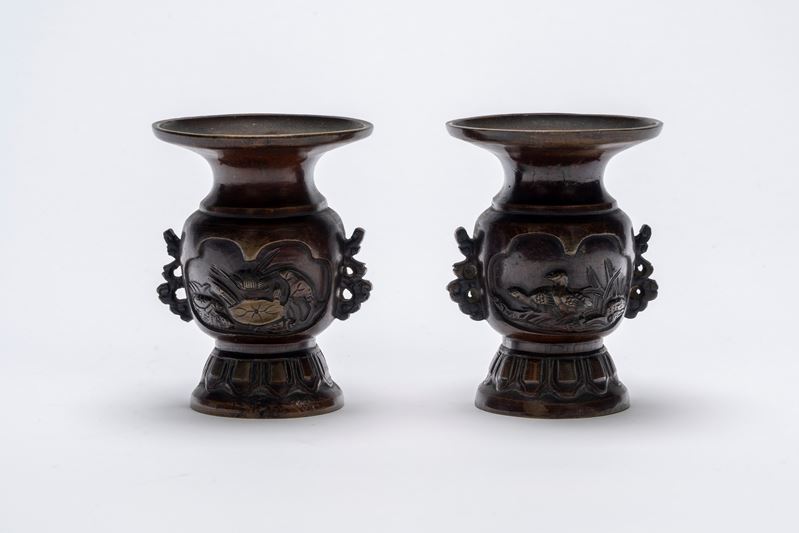 Coppia di vasi in bronzo decorazione a rilievo, incisione e doratura parziale, Giappone, periodo...