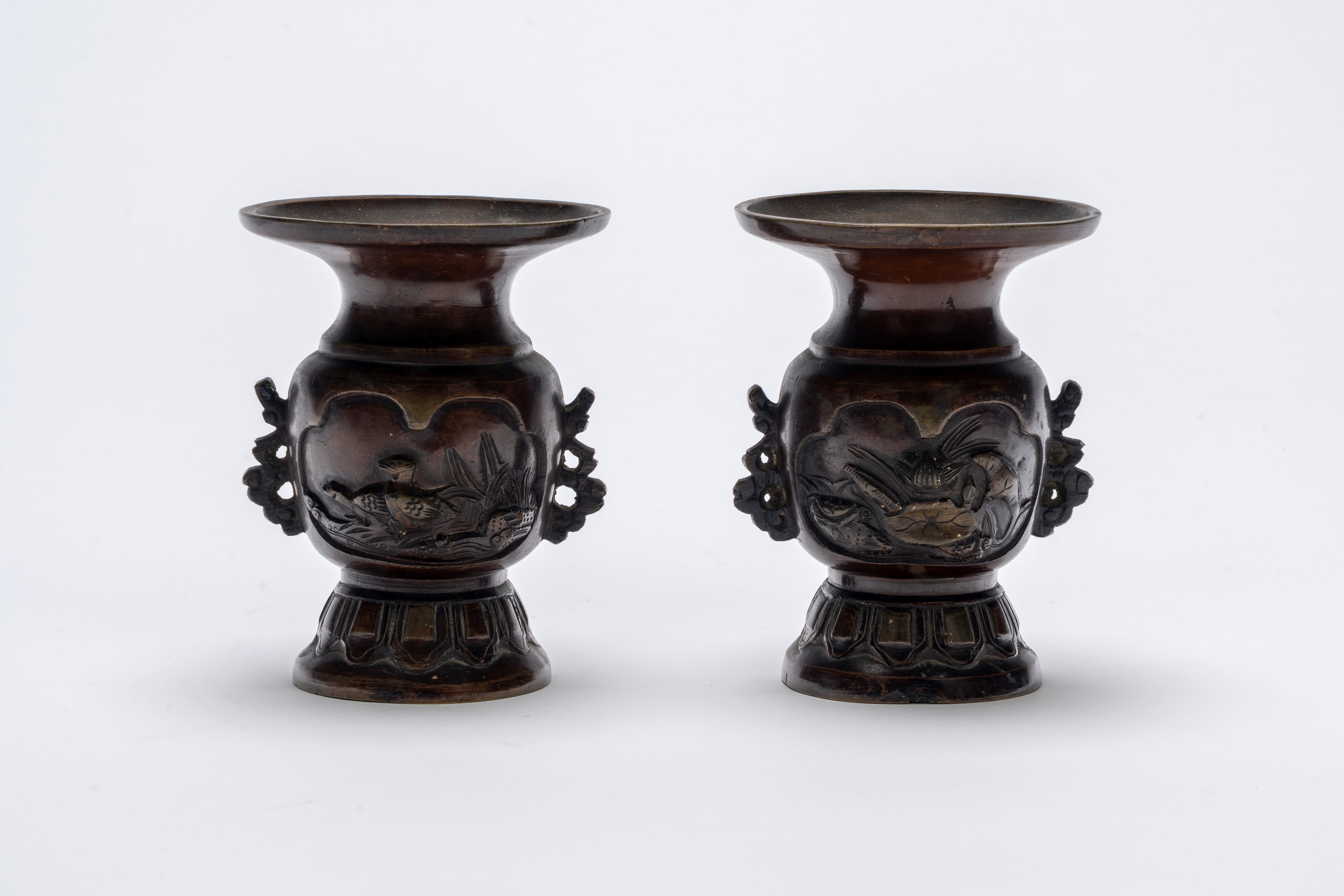 entrambi a corpo globulare schiacciato su alto piede a tamburo con base lobata a petali, bocca svasata a tromba, in bronzo brunito con bella patina bruna uniforme; ciascun esemplare decorato in rilievo sul corpo con riserva sagomata raffigurante uccelli acquatici tra fiori di loto e fogliame palustre, affiancata da due manici laterali figurati; fascia inferiore del corpo a petali di loto stilizzati raccordati al piede.