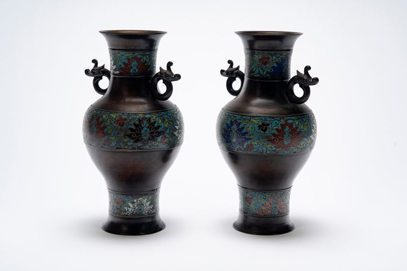 decoro a bande in smalto cloisonnè con fiori di loto a diversi colori, anse ad anello con chilong stilizzati; recano marchi a scrittura arcaica alla base.