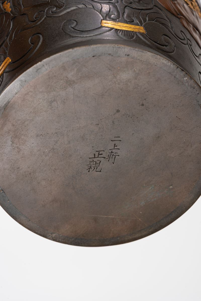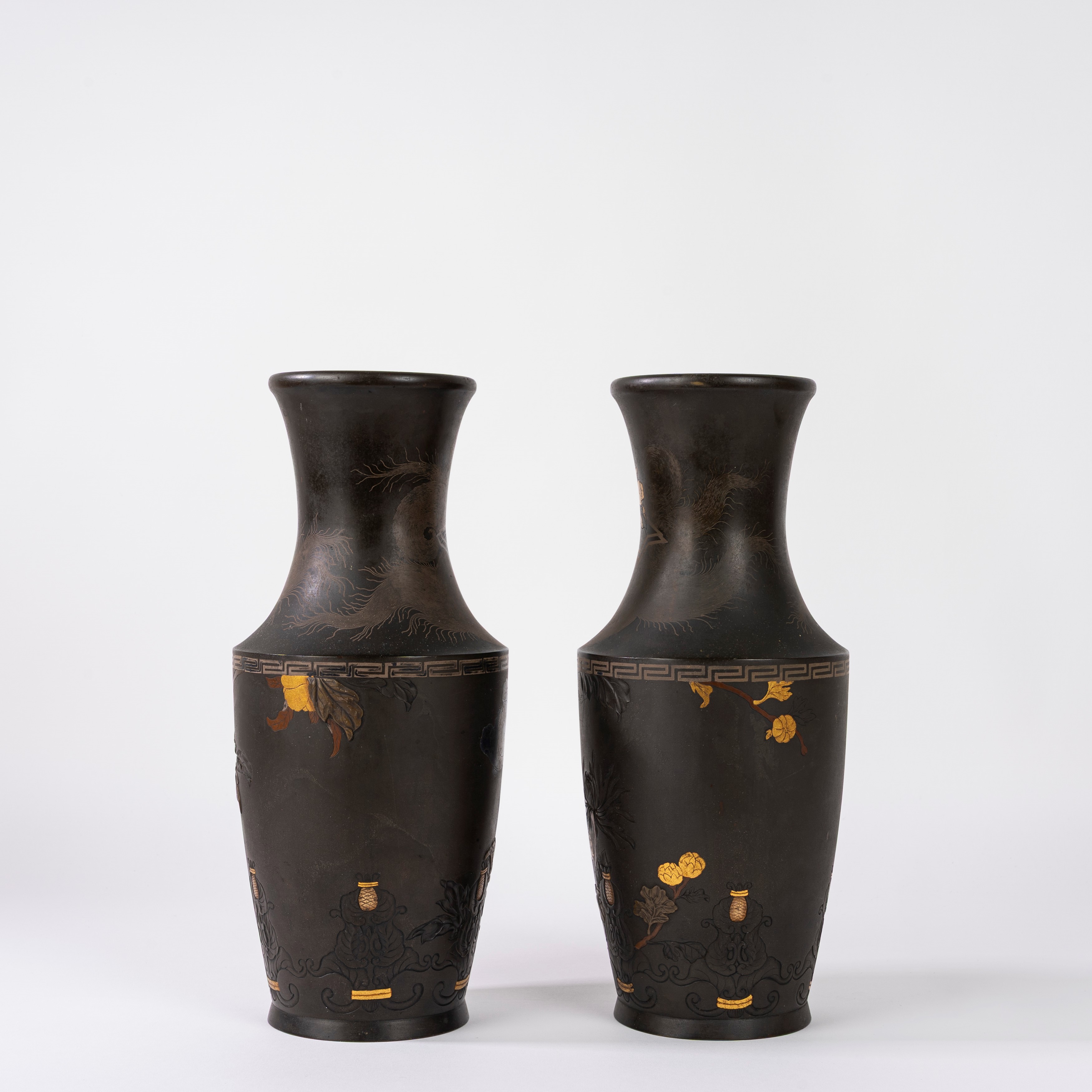 Coppia di vasi in bronzo decorazione a rilievo, incisione e doratura parziale, Giappone, periodo Meiji