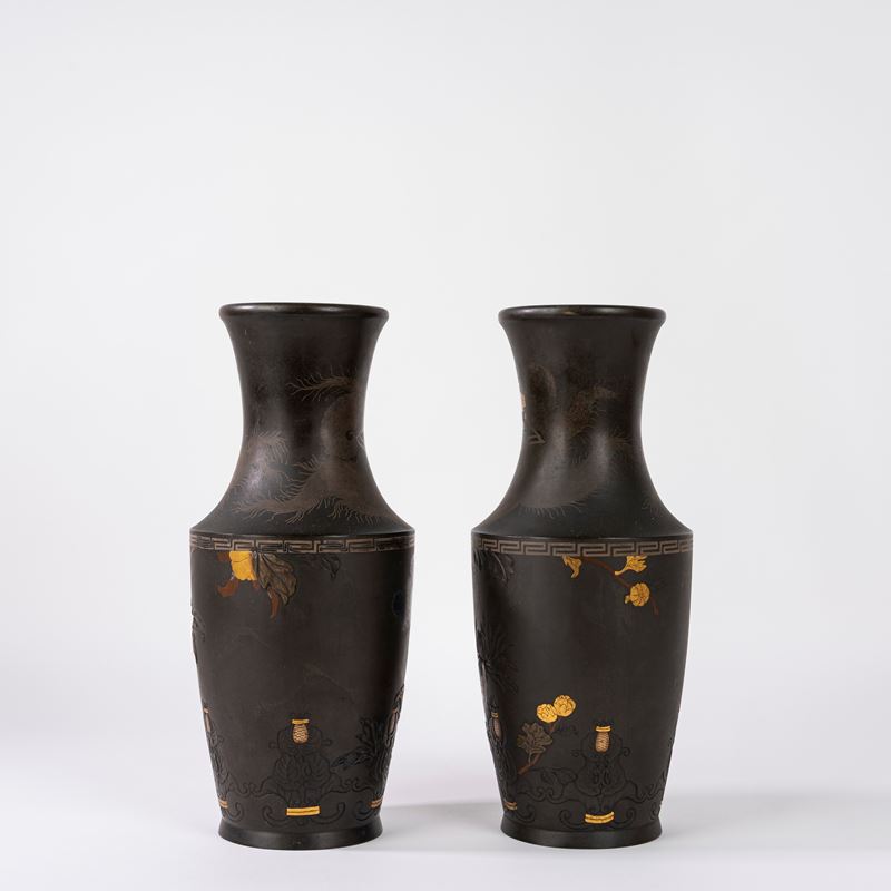 a corpo ovoidale allungato con collo svasato su fondo bruno-nero patinato. La decorazione è eseguita a rilievo, incisione e doratura parziale con motivi floreali naturalisti su due registri separati da un fregio a greca; sul fronte rami fioriti di peonia e crisantemo su fondo scuro inciso a volute di nubi, al retro rami di melograno e motivi vegetali su fondo inciso con gru tra le nuvole, resa a sottile incisione sul collo.