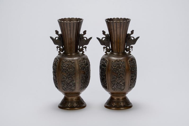 corpo ovoidale su alto piede svasato, in bronzo brunito, ciascuno decorato a pannelli in rilievo con uccelli tra fiori e rami fioriti, il collo scanalato a profilo lobato affiancato da due manici figurati a fenice; bella patina uniforme.