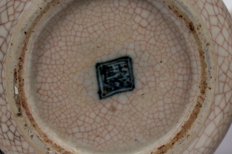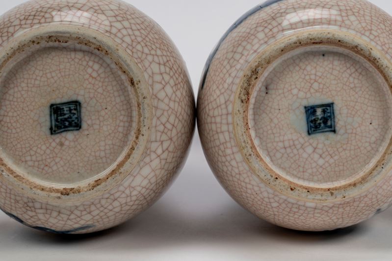 a corpo allungato e collo stretto, rivestite da invetriatura con fitto craquelé rosato, decorate in blu sotto vetrina con motivi naturalistici stilizzati, tra cui figure di cervi, uccelli e vegetazione. Al fondo, marchio in blu entro riquadro.