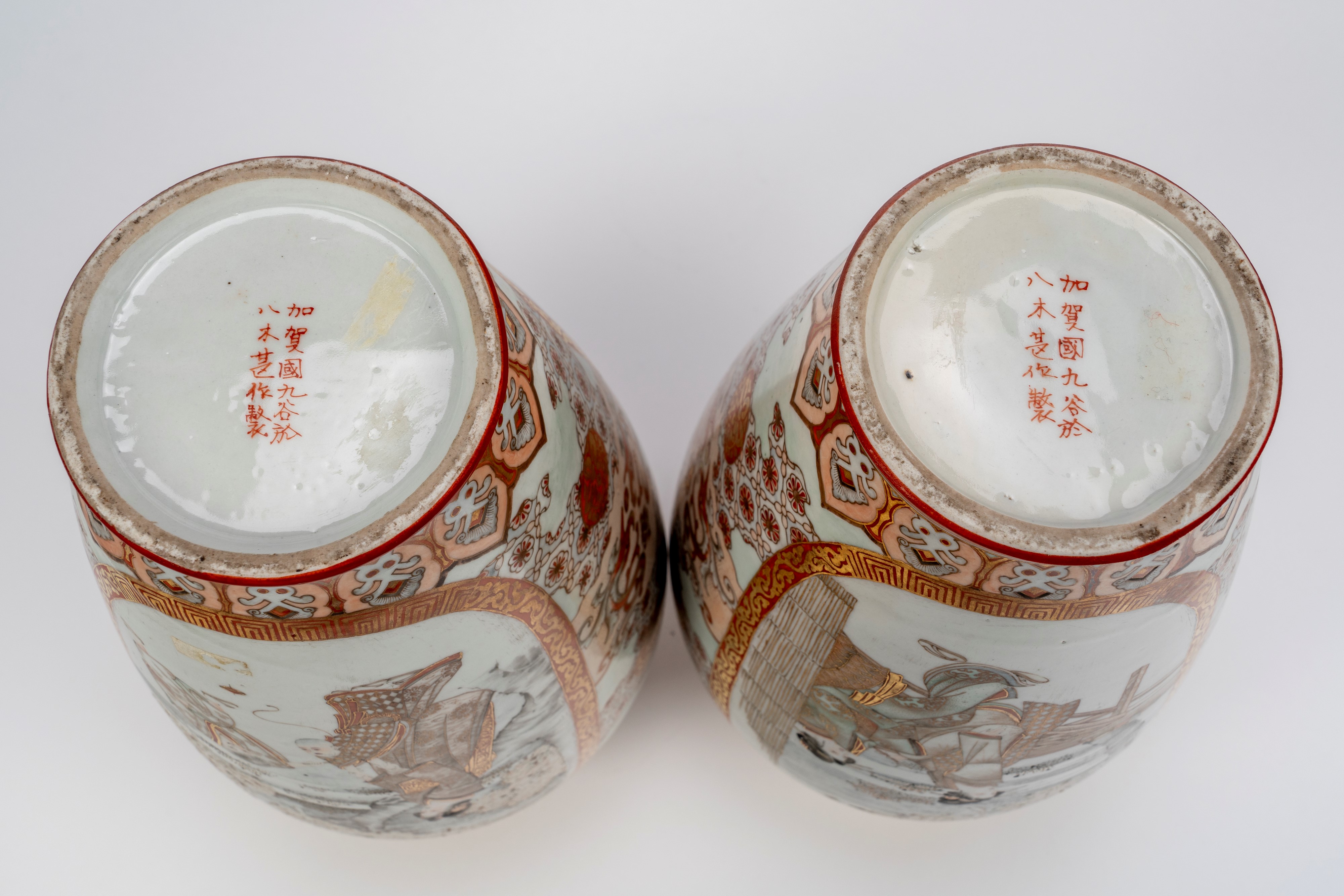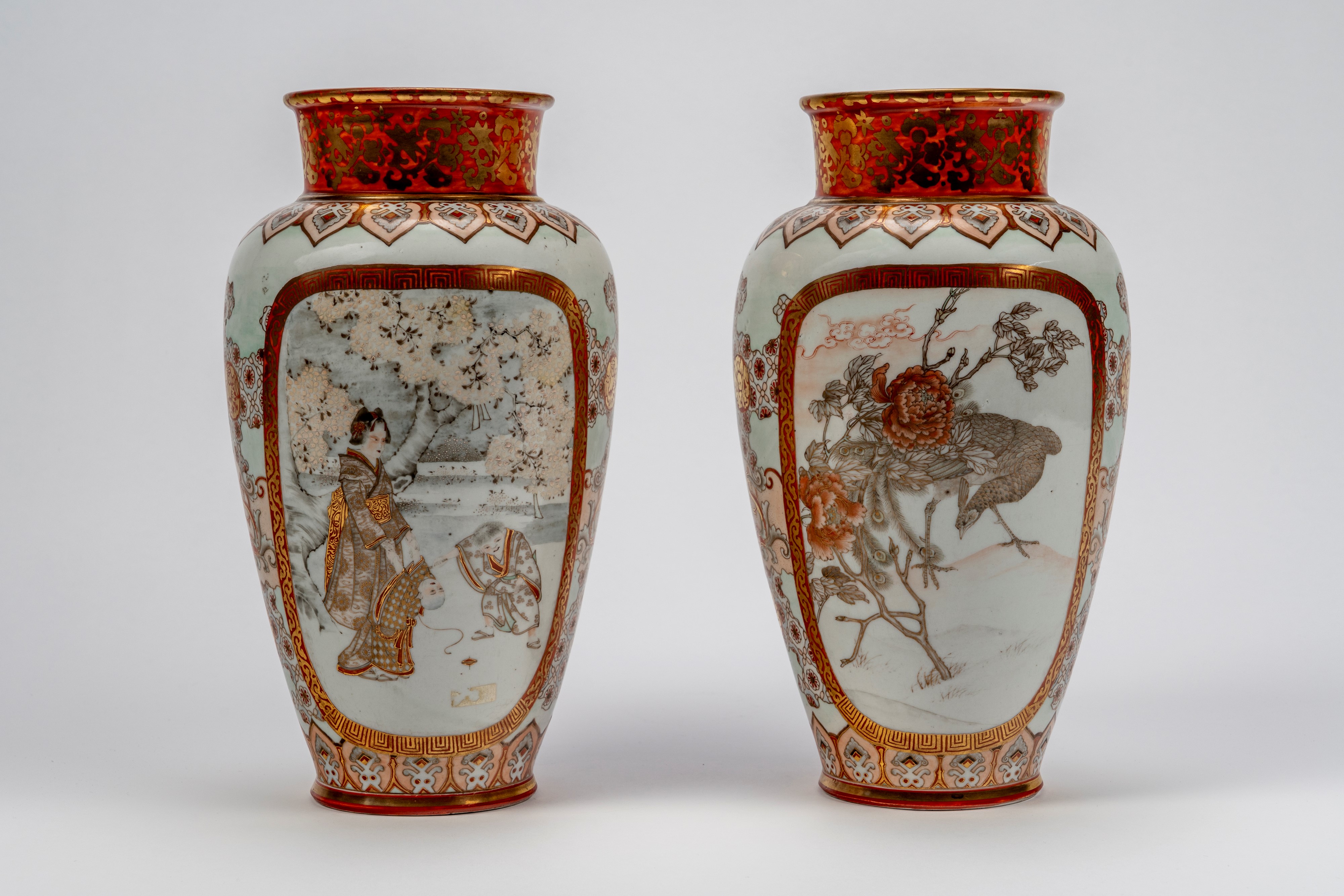 di forma ovoidale con collo svasato, decorati alterna fondi in rosso corallo con motivi floreali dorati a pannelli su fondo bianco, uno con figure femminili in kimono tra sakura in fiore, l'altro con uccello tra rami di peonia; collo, spalla e base con fregi geometrici tipici del repertorio Kaga-Kutani. firmati Yagi Jinpei