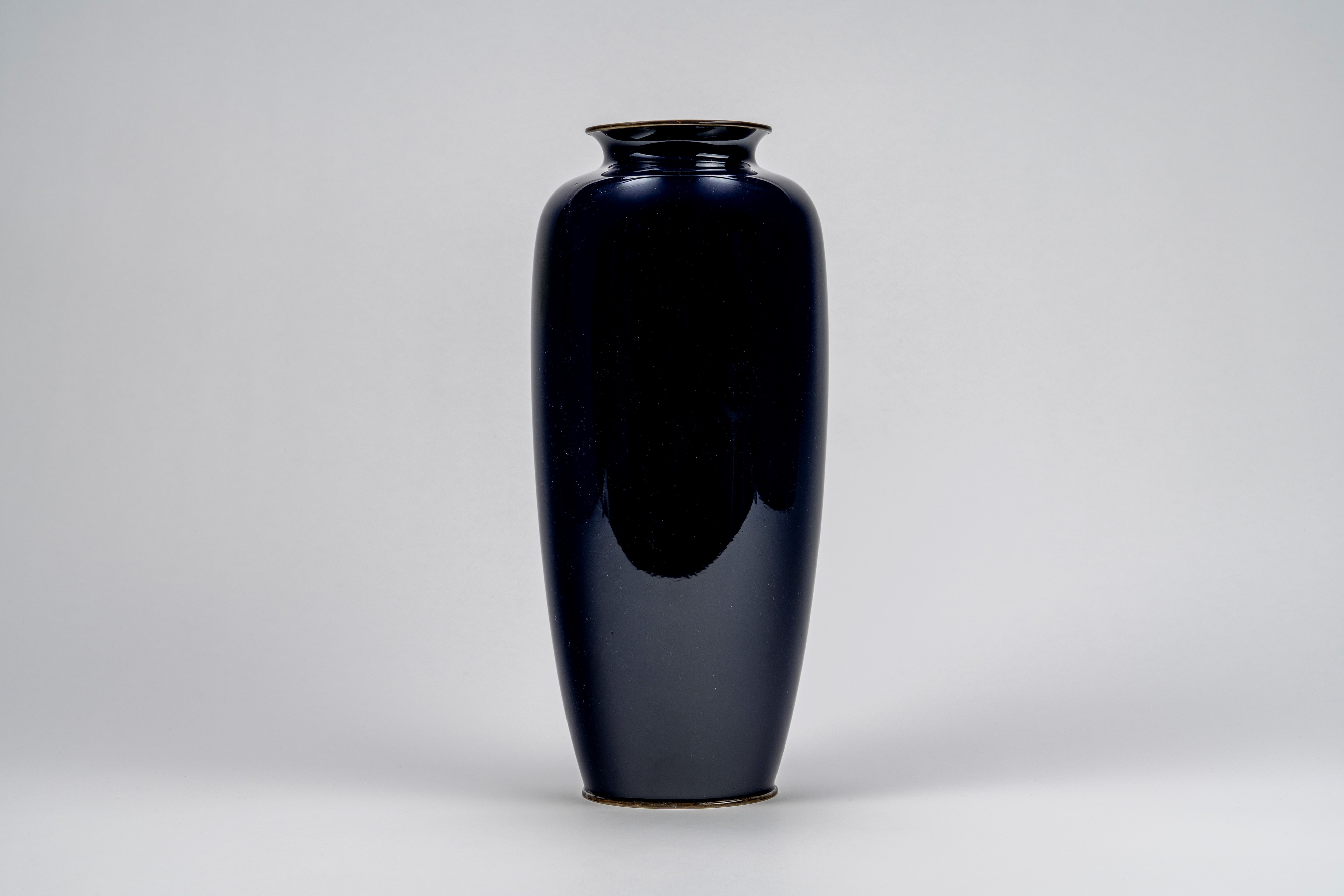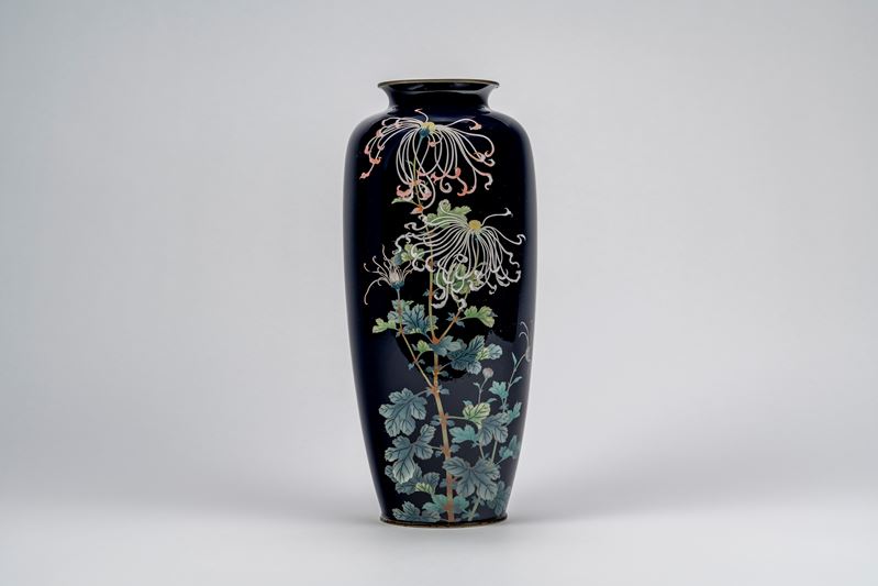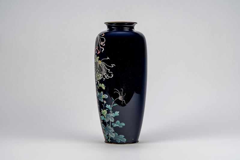 Elegante vaso cloisonné decoro con fiori a sfondo blu notte, Giappone, periodo Meiji