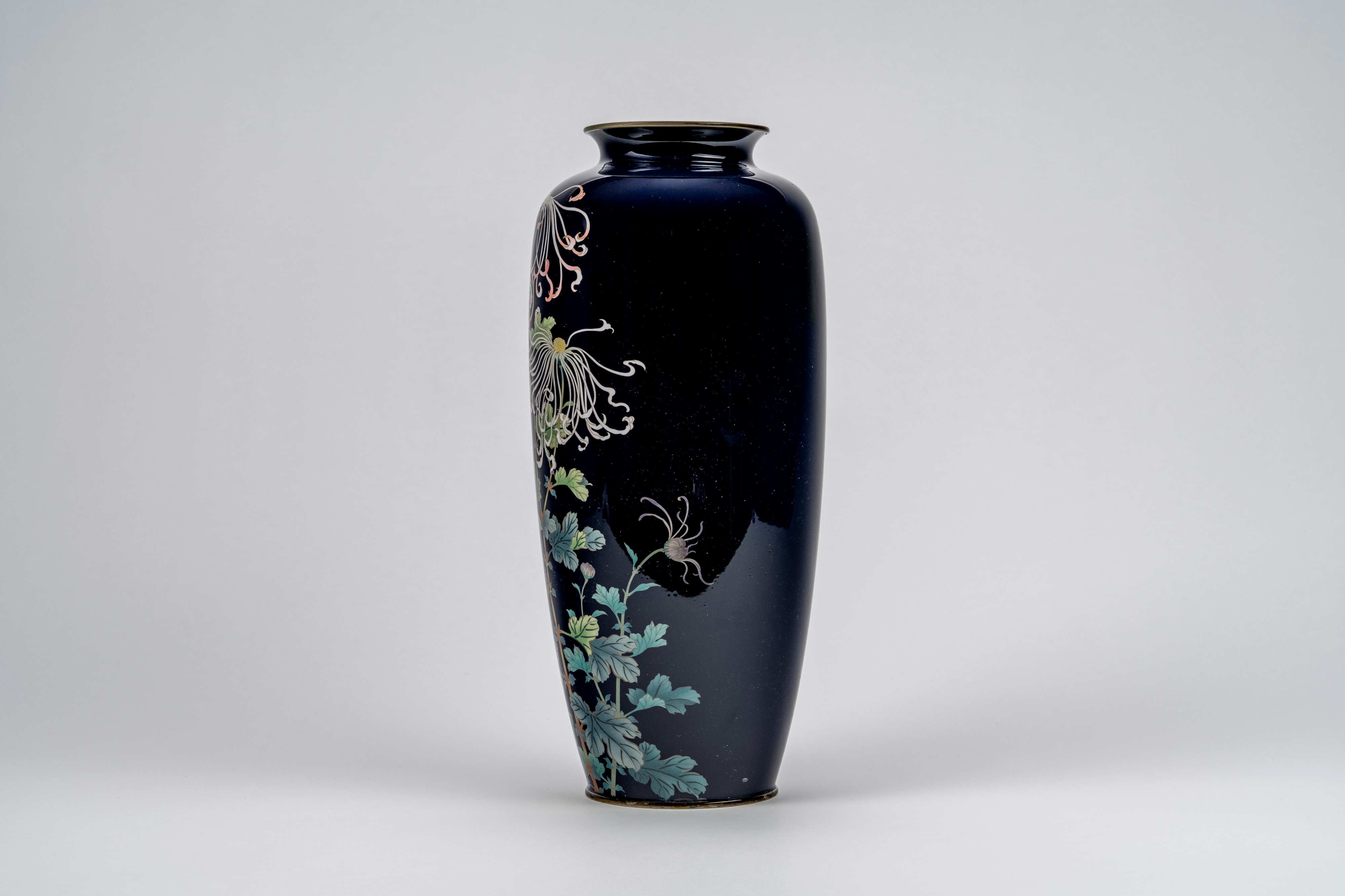forma ad anfora allungata con spalla arrotondata, collo corto leggermente rastremato e bocca svasata con bordo in metallo brunito, su sottile piede ad anello. Sul fondo blu cobalto profondo una composizione floreale asimmetrica con crisantemi a petali filiformi; marchio impresso alla base