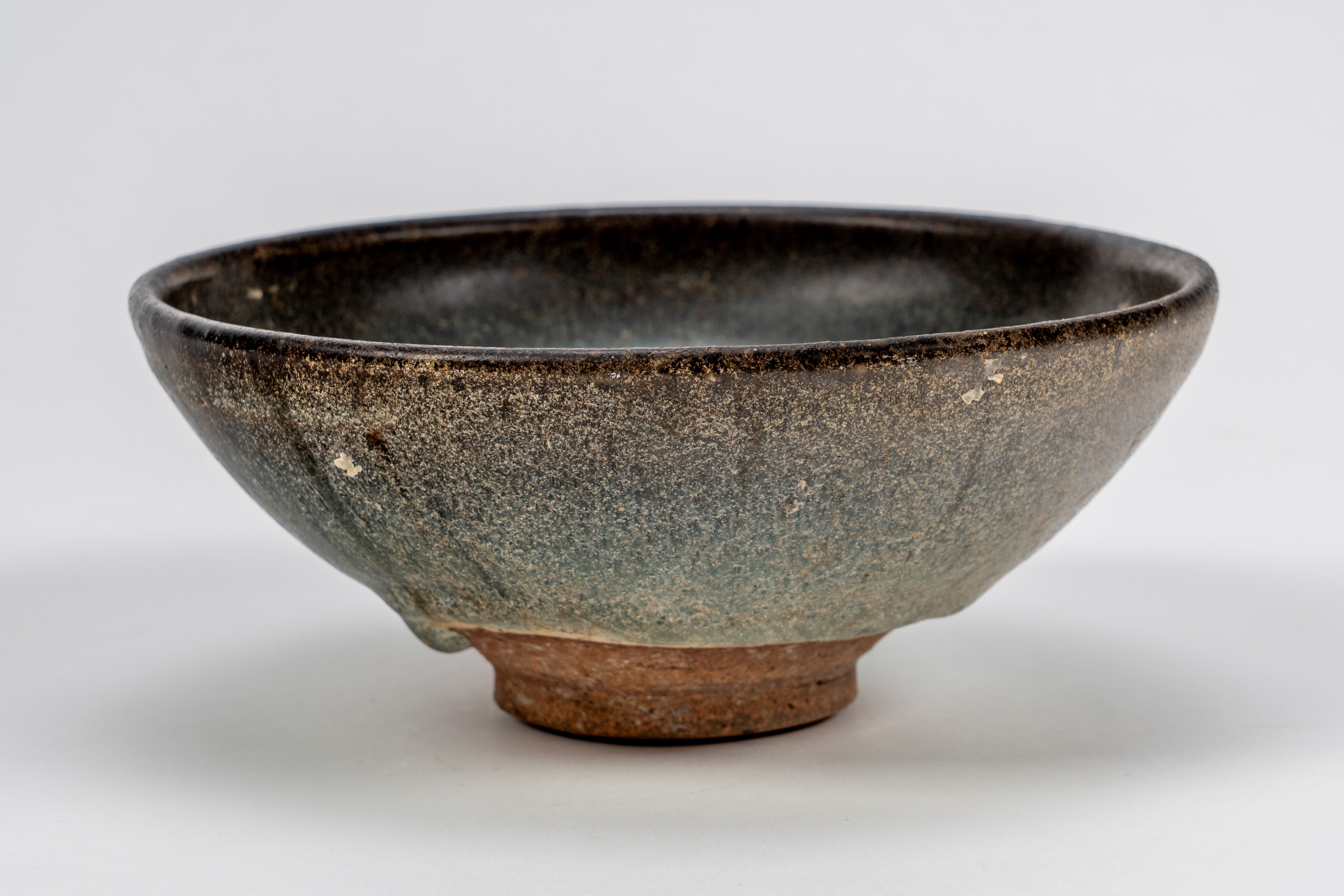 di forma emisferica con pareti svasate, orlo assottigliato e piede ad anello basso, la vetrina nero-bruno intenso nella fascia superiore e sull'orlo, con transizione a turchese-grigio-verde nella parte inferiore del ricoperta da una smaltatura blu verdastra che si schiarisce senza raggiungere la base; l'interno con medesimo effetto, base parzialmente smaltata.