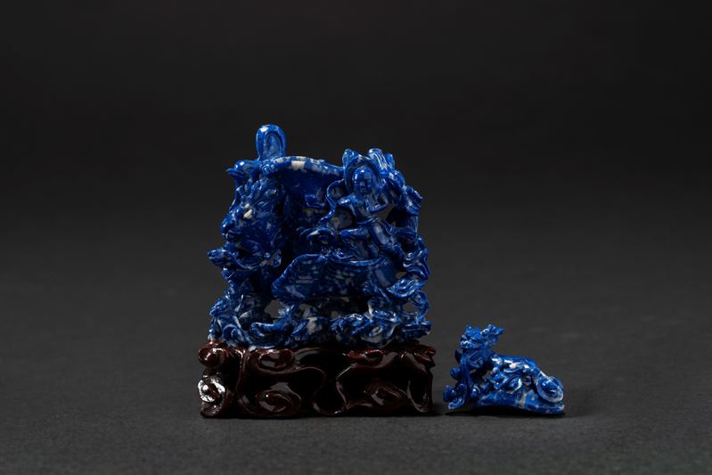 Piccolo vaso scultura o snuff bottle in lapislazzulo scolpito raffigurante drago con figure, Cina, fine XIX secolo / inizi XX secolo