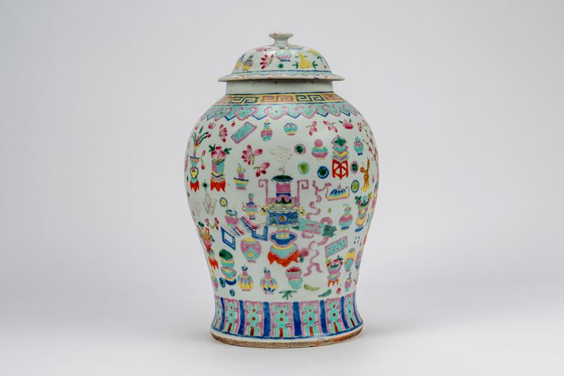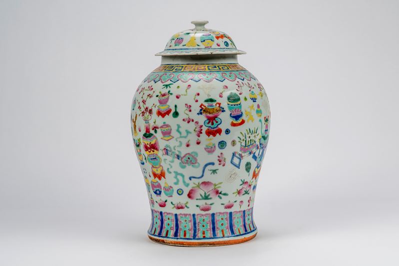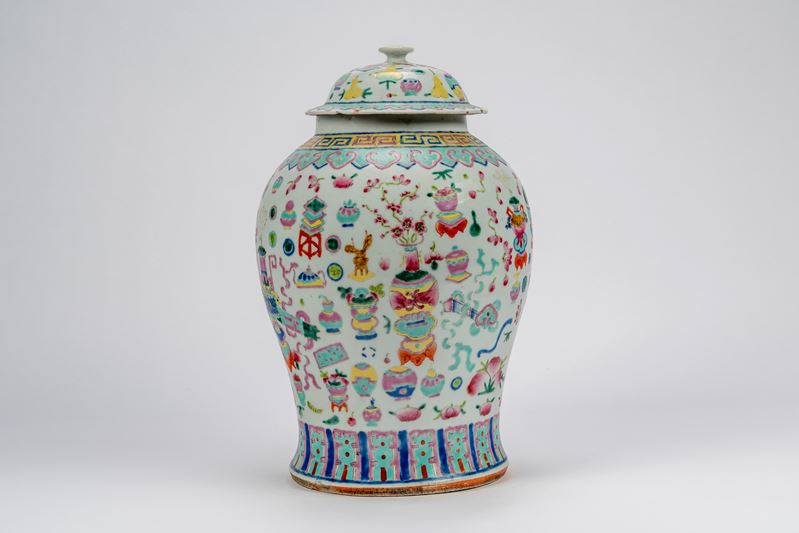 Grande vaso balustrato con collo breve, spalla arrotondata e base svasata, corredato di coperchio a calotta con presa a bottone; la decorazione in smalti policromi su fondo bianco, presenta sotto il collo un fregio leiwen, seguito da una fascia di nuvole ruyi in rosa e turchese, sul corpo un fitto repertorio di oggetti, vasi da fiori, bronzi arcaici, la fascia inferiore presenta pannelli verticali alternati in rosa e turchese su sfondo blu. Il coperchio riprende il medesimo repertorio decorativo in scala ridotta.