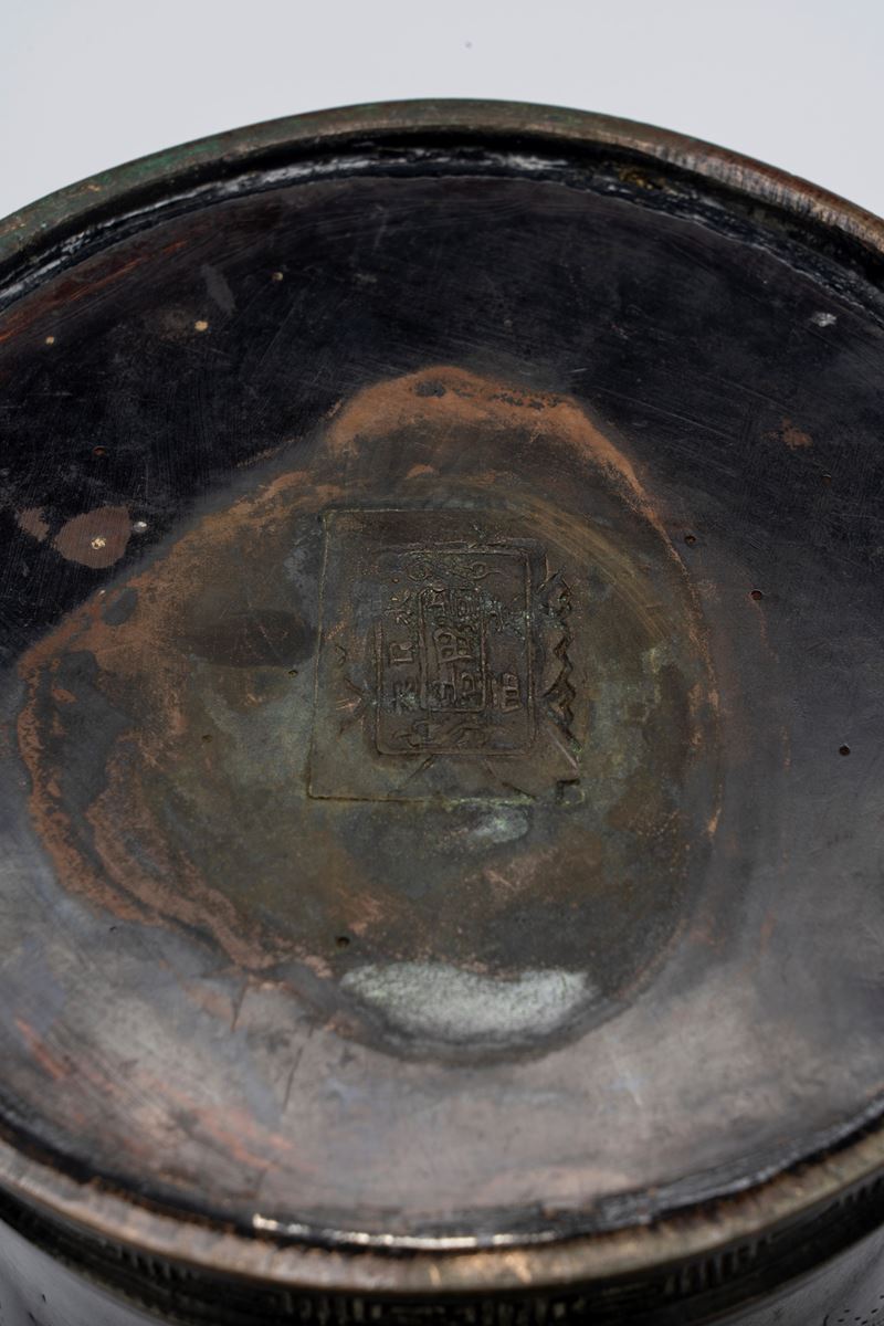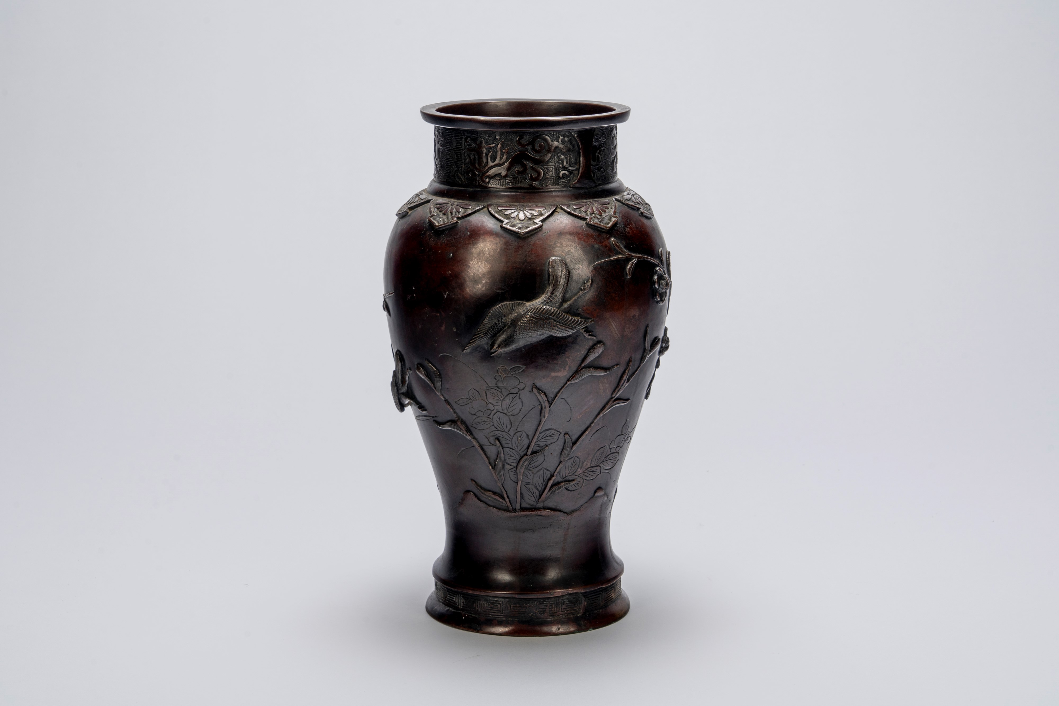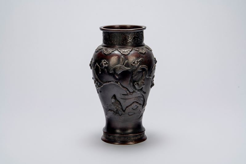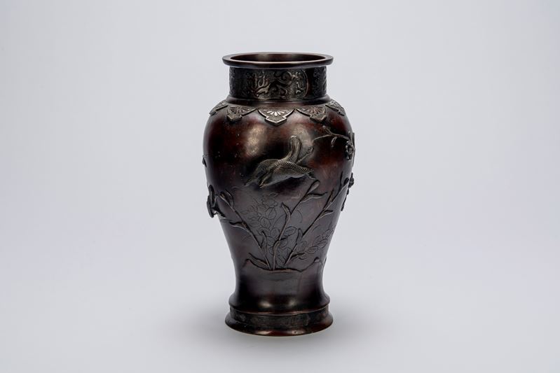 corpo ovoidale in bronzo brunito, decorato a rilievo e incisione con uccelli tra rami fioriti e rocce, il collo e la base ornati da fasce a motivi vegetali stilizzati; marchio rettangolare fuso sotto la base.