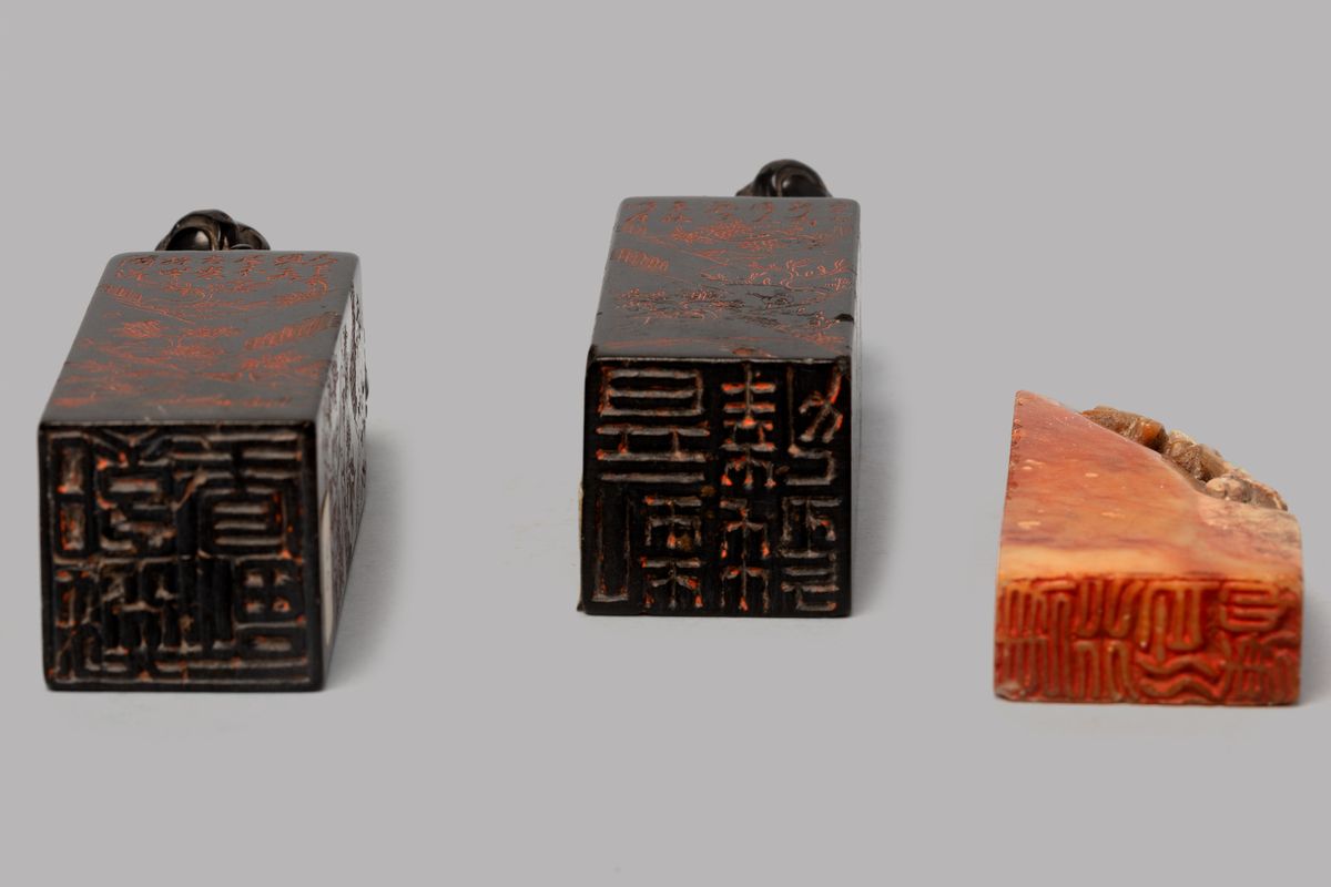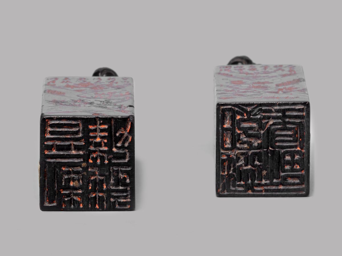 sui lati iscrizioni e paesaggio, sormontati da cani di Pho, ideogrammi sotto la base (la coppia)