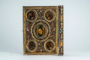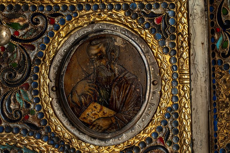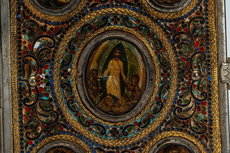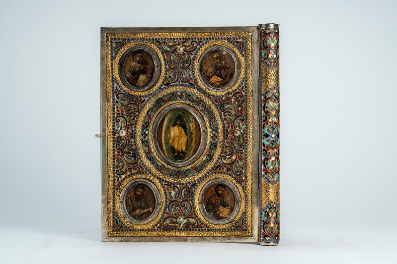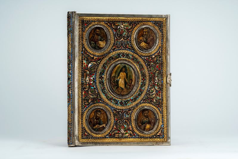 Coperta doppia di Evangeliario in argento cesellato e smalti policromi cloisonné, decorata con miniature entro medaglioni raffiguranti la Discesa di Cristo agli inferi e la Resurrezione tra i quattro evangelisti. San Pietroburgo, 1886