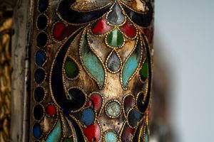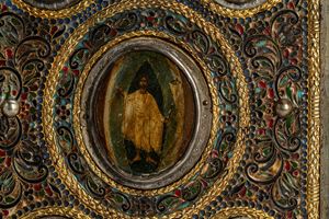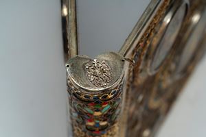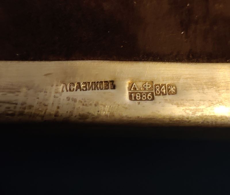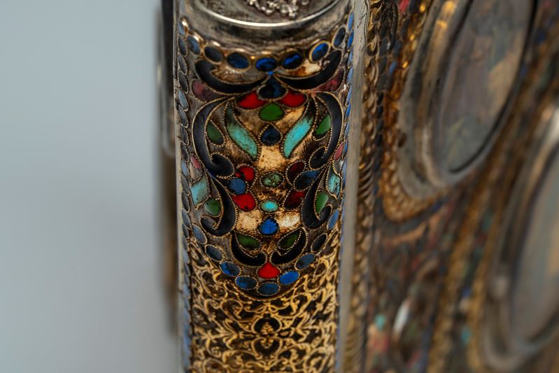 Chiusura decorata con fregio ad aquila bicipite imperiale. Reca punzone dell’argentiere Sazikov, dell’assaggiatore Aleksandr Frans Fan-der-Flit, 1886, 84 zolotniki, San Pietroburgo.