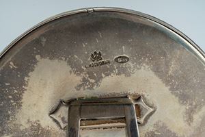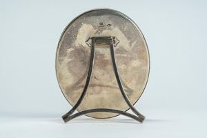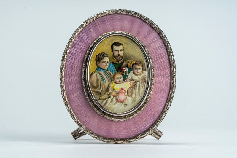 Cornice portafoto con cavalletto in argento con bordura cesellata a ghirlanda, all’interno stampa con ritratto di Nicola II, dell’imperatrice Aleksandra Fëdorovna e delle prime due figlie. Probabilmente San Pietroburgo, 1908–1926