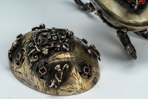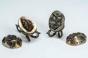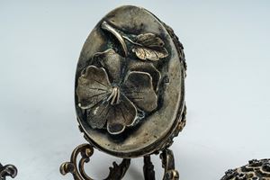 Due uova con coperchio in argento e cabochon una decorata a rilievo con pavone e l’altra con putti e ghirlande di fiori. Russia, fine XIX secolo