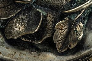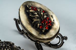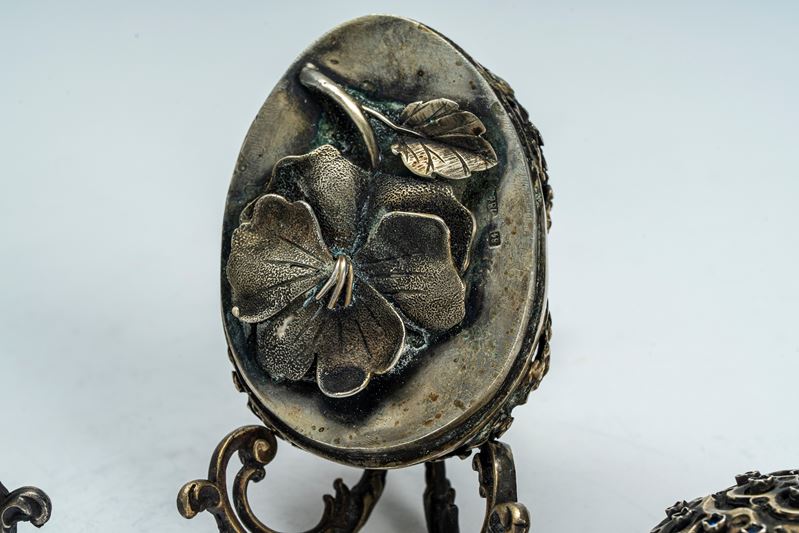 All’interno celano sorpresa a motivo floreale. Poggianti su sostegni a tre volute. Recano punzone con data 1886 e titolo 84 zolotniki.