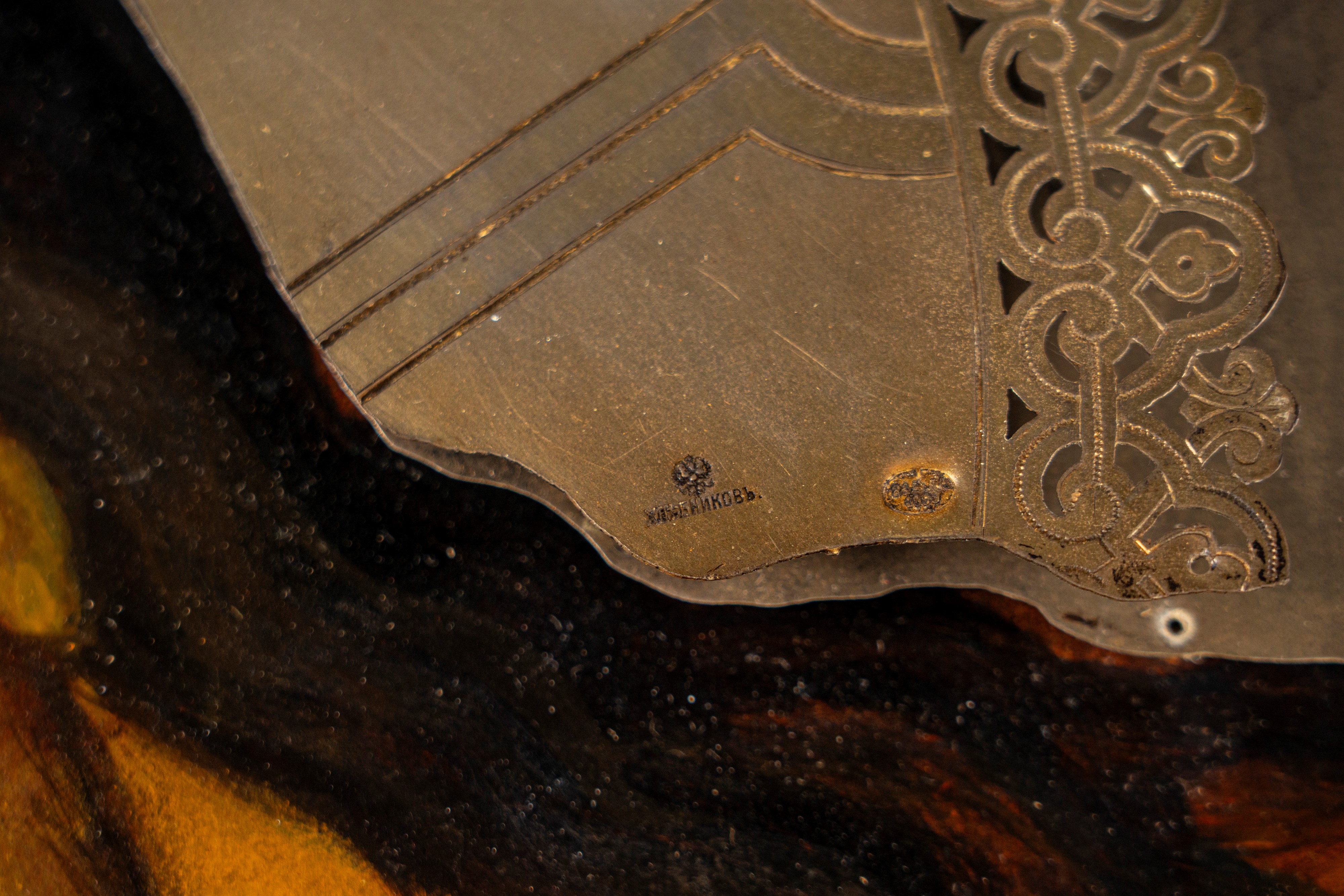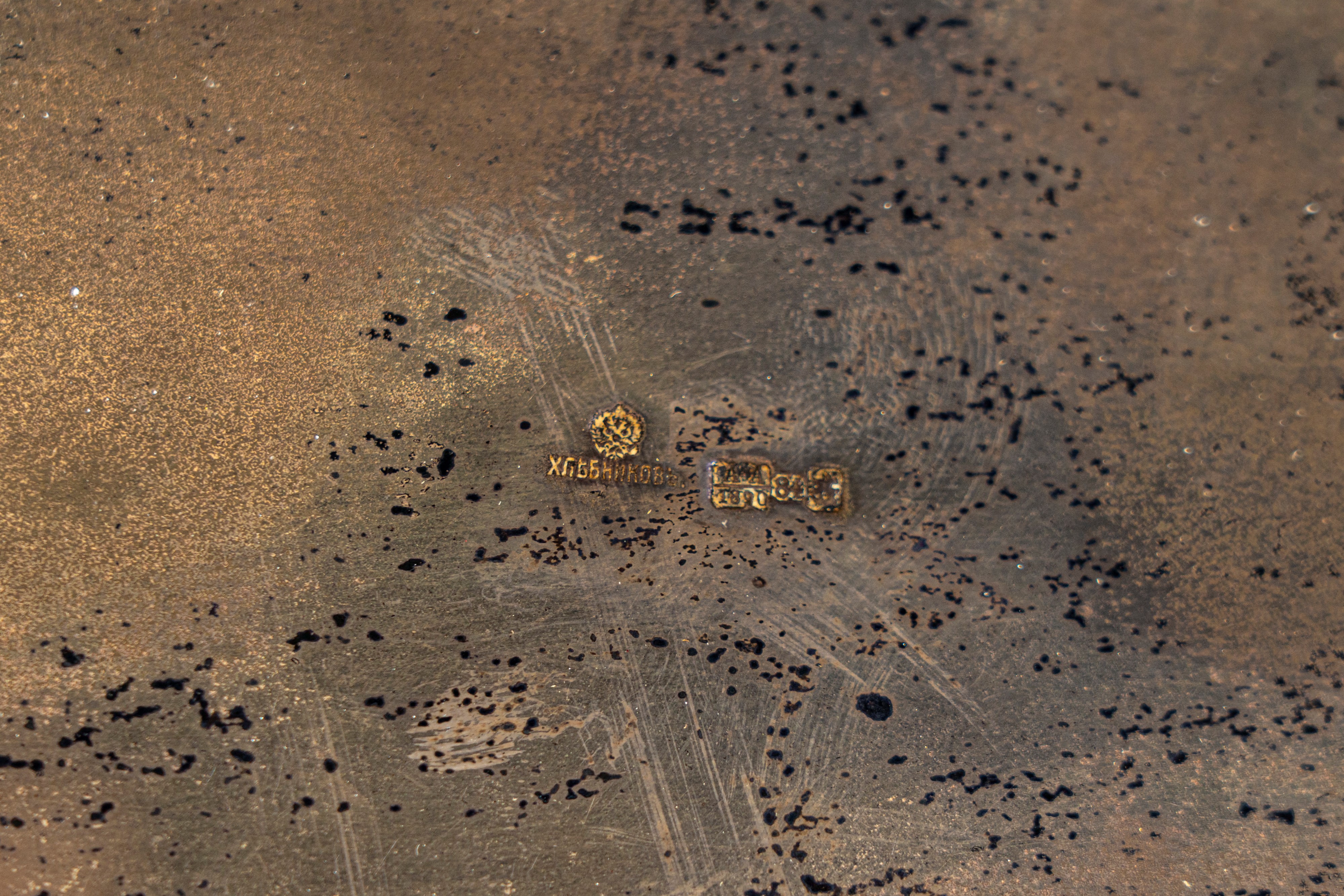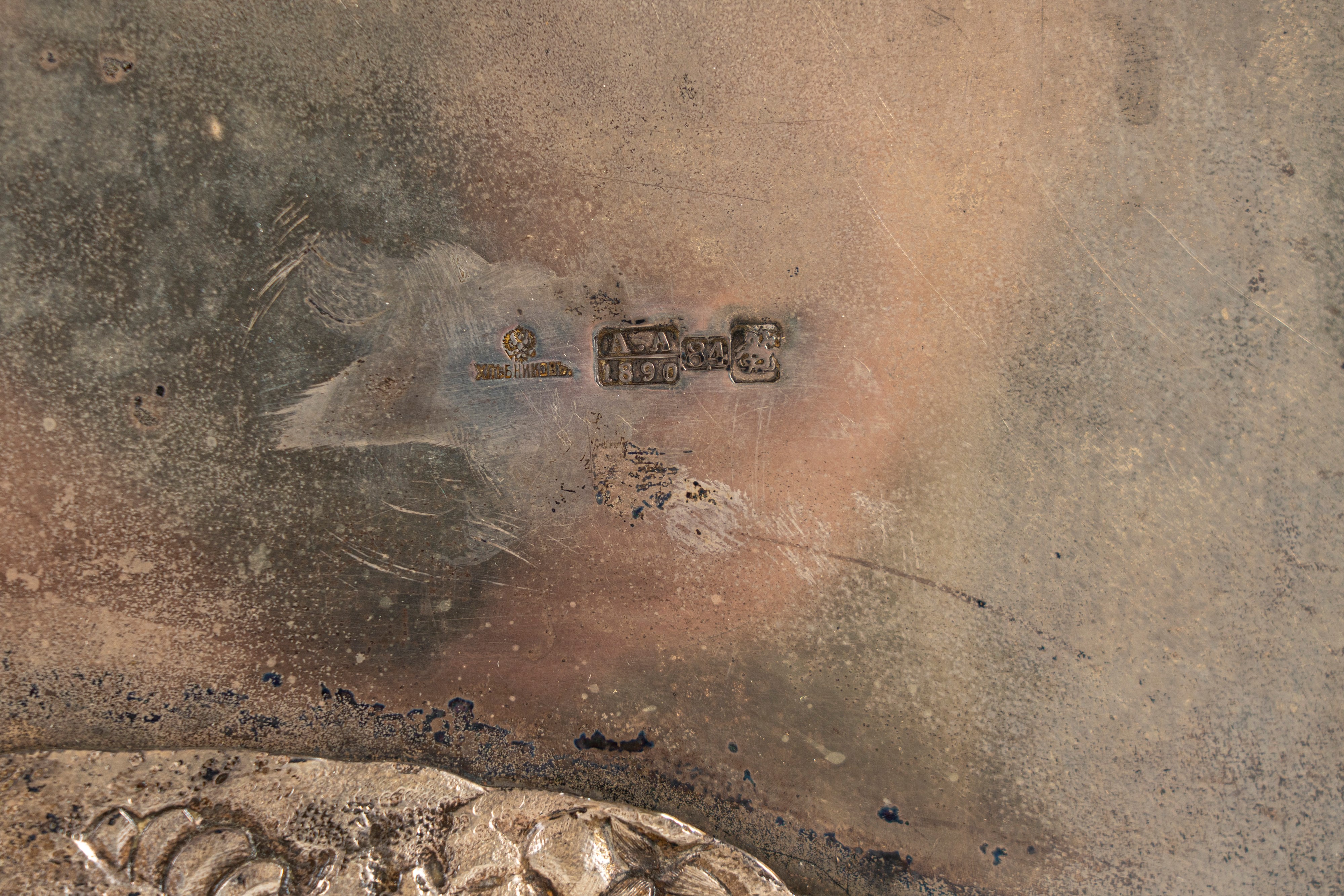 Reca punzoni dell’argentiere Khlebnikov con emblema imperiale e dell’assaggiatore Anatoly Apollonovich Artsybashev, Mosca, 1890.