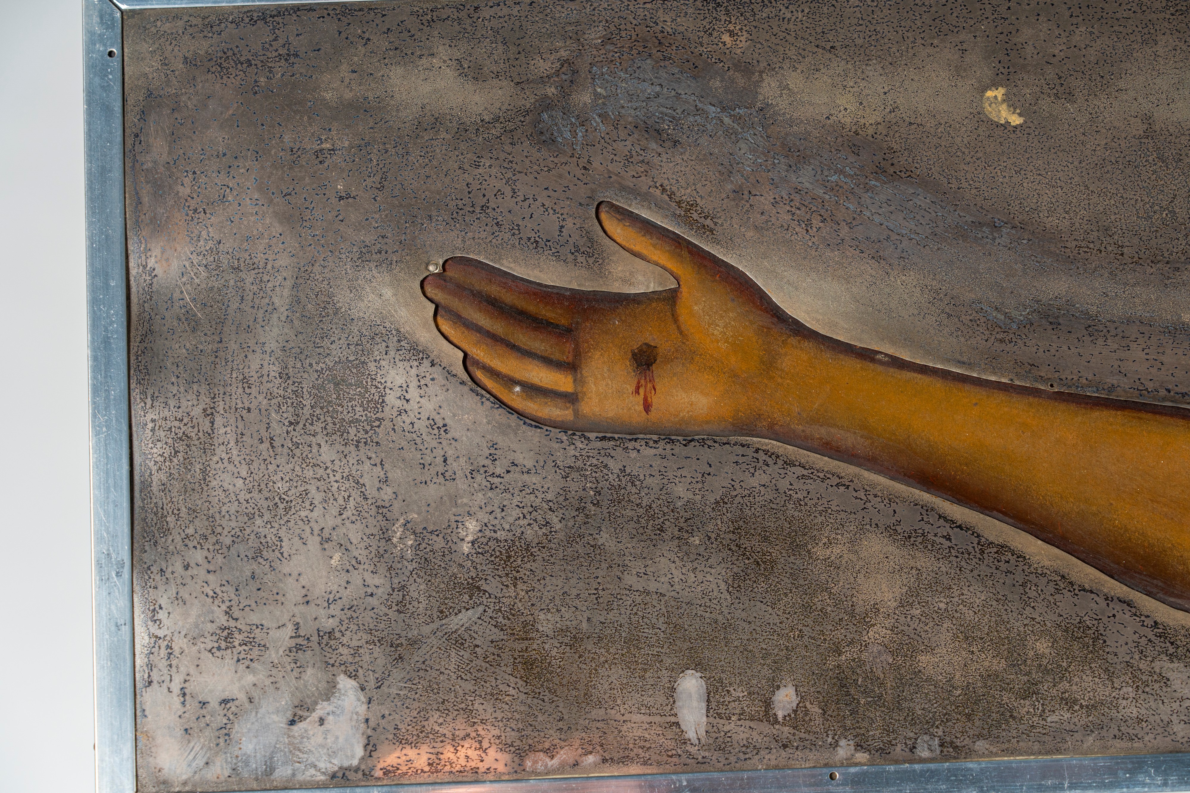 Il crocifisso è ricoperto da un rivestimento in lamina d’argento e argento dorato che lascia scoperti il corpo di Gesù, reso con realismo, il volto e le mani di Dio Padre, sotto il quale appare la sigla “ІНЦІ” (Gesù il Nazareno, il Re dei Giudei). Accanto al corpo di Cristo la lancia e la spugna; ai suoi piedi, sul monte del Golgota, si apre la caverna resa nei dettagli naturalistici con il teschio di Adamo, simbolo dell’umanità redenta con il sacrificio di Cristo. Il panneggio in argento, argento dorato e cesellato è reso con grande naturalismo nelle sue pieghe; le aureole sono aggettanti e con bordo traforato.