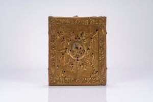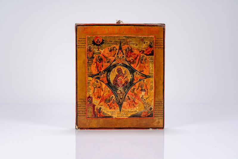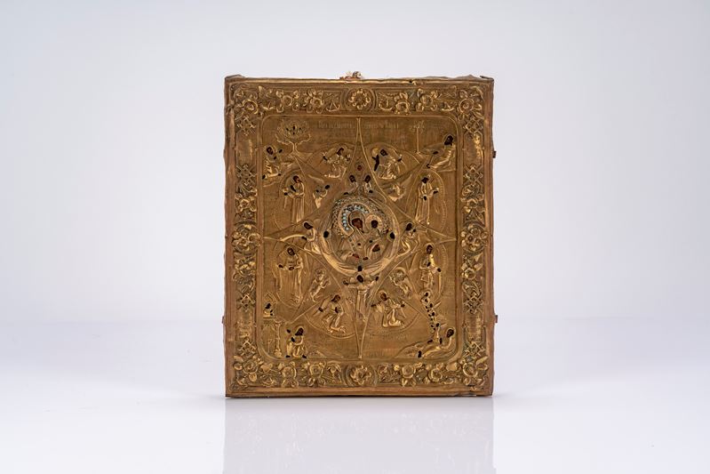 Icona a tempera su tavola con riza in metallo dorato e applicazioni di paste vitree colorate raffigurante la Madonna del Roveto ardente. Russia, XIX secolo